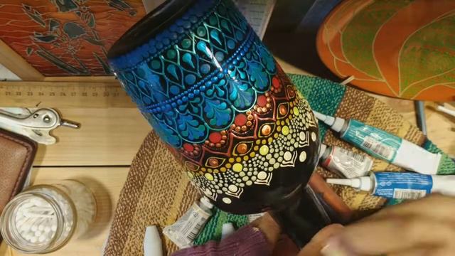 точечная роспись стеклянной бутылки акриловыми контурами