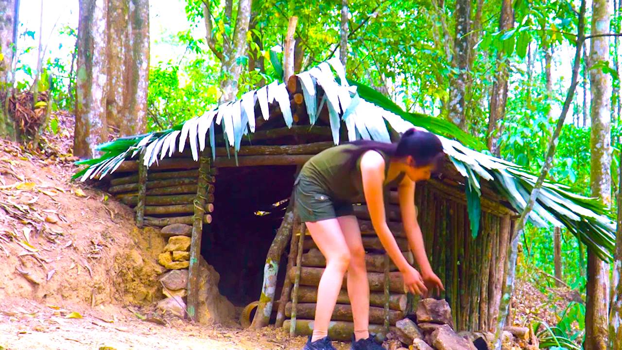 Красивая Девушка Выживает в лесу в реальной жизни Строит хижину Приготовление еды на костре