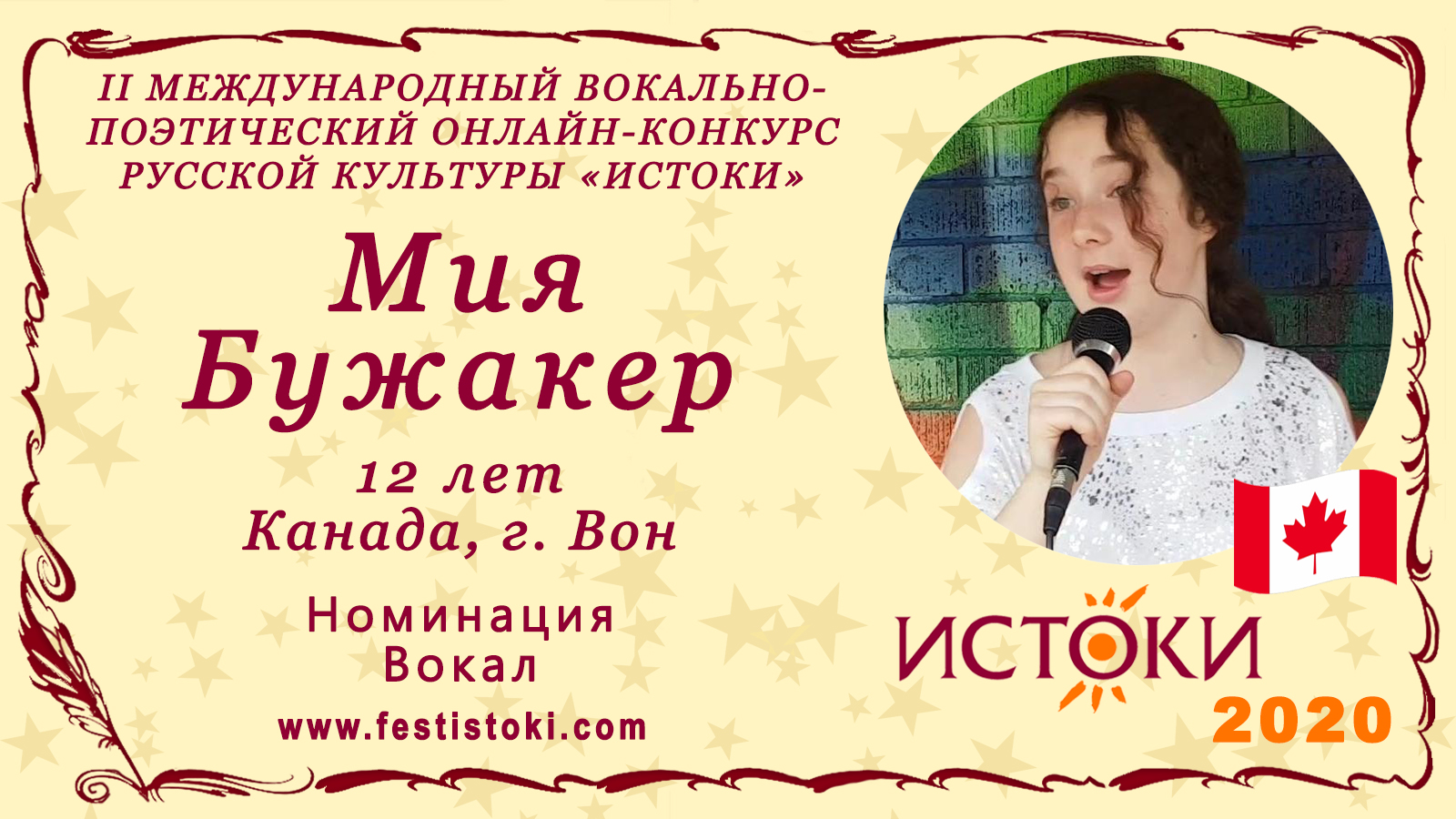 Участник II Международного вокально-поэтического онлайн-конкурса русской культуры «Истоки». Номинация - Вокал. Песня "Миллион алых роз". Авторы А. Вознесенский, Р. Паулс. Сайт: www.festistoki.ru / www.festistoki.com E-mail: festistoki@mail.ru
