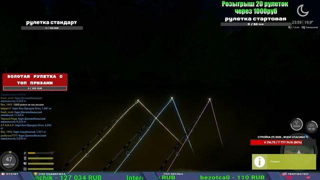 Поддержка донатом https://www.donationalerts.com/r/kalyamba11 Альтернативный донат https://new.donatepay.ru/@1032463 5536913964533059 карта Тинькоф Если стрим лагает,смотри стрим на трово https://trovo.live/s/Kalyamba_na_Ribalke Мой ВК - https://vk.com/kalyantv НИК в игре kalyan11 НАШ ДИСКОРД СЕРВЕР https://discord.gg/mSbnTJK8TB Заказ водоема на 1 час - 500р ( весь стрим 2500р ) Модерка на канале 1200р ( каждая следующая на 100р больше) Озвучка доната на 40р,50р,100р,200р,300р,500р,1000р ✅Призы в рулетке "ЗОЛОТАЯ" ✔ ЗОЛОТО ✔ ПРЕМ ✔ КАТУШКИ РАПТОР 40, АЗИМУТ 10000, СИЛЬВЕР 80, ТАЙГА с 30 ✔ ПАЛКИ ПИЛКЕРНАЯ, ДОНКА МОРСКИЕ, ✔ РОД ПОД, СТУЛЬЯ ✅Призы в рулетке СТАНДАРТ : ✔ катушка "РАПТОР 40" ✔ катушка "АЗИМУТ 10000" ✔ катушка "ТАЙГА С30, С40," ✔ катушки 60 для медного ( ЭВИИ, НАТОРЫ, ГОЛДА, и тд) ✔ ПИЛКЕРНОЕ УДИЛИЩЕ КОРОЛЕВА ОКЕАНА ✔ Морское Донное удилище ✔ прем ( 3, 7, 30 дней) ✔ золото ( 1, 3, 5, 10, 20 ,50) ✔ билет на море ( 1, 3, 5 дней) ✔ голд наживка и др. ✅Призы в рулетке "СТАРТОВАЯ" ✔ катушка "silver80" ✔ катушка "БЕЛЫЙ КАЛИБР" ✔ катушка "Черный калибр" ✔ катушка "Протон" ✔ катушка "Нарга 6000" ✔ Набор Фидерист и спинингист ✔ Карповик Фортуна ✔ фидерные удилища ✔ прем, золото, алкашка, наживки и тд P.s Рулетка это не казино, а награда за поддержку стримера. Вечный ТОП ПОДДЕРЖКИ (11.05.2024) 1. Dimon_pokemonchik 119 784 2. Interceptor 75 508 3. Skreb79 71 261 4. une personne 68 619 5. Нарвал77 31 550