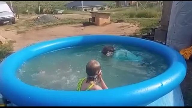 Установили бассейн для детей. Дети счастливы купаются в бассейне. Отдых не выходя из дома, детям весело.