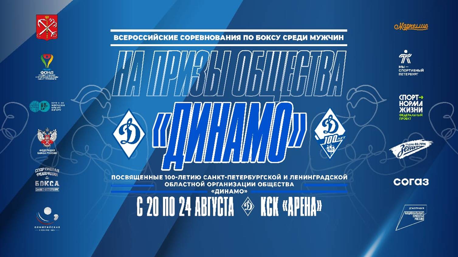 Всероссийские соревнования по боксу «На призы Общества «Динамо», посвящённые 100-летию Санкт-Петербургской и Ленинградской областной организации Общества «Динамо» среди мужчин Состав пар 1 Геворгян Ашот Краснодарский ЮФО Панов Михаил Татарстан ПФО Весовая категория 57 кг 2 Демидов Сергей Курган УФО Федорцов Андрей Краснодарский ЮФО 3 Мельников Артём Башкортостан ПФО Тычков Артём Красноярский СФО 4 Пегливанян Андрей Краснодарский ЮФО Эргашев Ибрахимжон Татарстан ПФО 5 Семяшкин Владислав Коми СЗФО Варосян Артур Ивановская ЦФО Весовая категория 63,5 кг 6 Тюлемешев Хункерхан Татарстан ПФО Алиев Джабраил Московская ЦФО 7 Годжаев Махаддин Магаданская ДФО Лебедев Андрей Москва ЦФО 8 Зубков Сергей Санкт-Петербург СЗФО Таибов Тагир Ульяновская ПФО ПЕРЕРЫВ 30 мин Весовая категория 67 кг 9 Шишегин Иван Москва ЦФО Величко Дмитрий Ивановская ЦФО 10 Джаппуев Расул Санкт-Петербург СЗФО Айдемиров Руслан Тульская ЦФО 11 Шуадаев Муслим Белгородская ЦФО Быстров Владимир Челябинская УФО 12 Галиев Али Самарская ПФО Аванесов Никита Челябинская УФО 13 Хотенов Владислав Татарстан ПФО Савельев Иван Тульская ЦФО 14 Шелопугин Владимир Калужская ЦФО Берендеев Евгений Краснодарский ЮФО 15 Голубев Иван Красноярский СФО Белевитин Данил Московская ЦФО Весовая категория 75 кг 16 Кушхов Амин КБР СКФО Давыдов Денис Магаданская ДФО Весовая категория 86 кг 17 Зонь Никита Красноярский СФО Ковальский Кирилл Тульская ЦФО 18 Рамазанов Шахзод Самарская ПФО Барков Евгений Московская ЦФО 19 Захаревич Никита Москва ЦФО Иванов Евгений Красноярский СФО 20 Магомедханов Гаджиибрагим Краснодарский ЮФО Невский Александр Москва ЦФО Весовая категория 92 кг 21 Петрович Ян Красноярский СФО Мясников Валерий Москва ЦФО