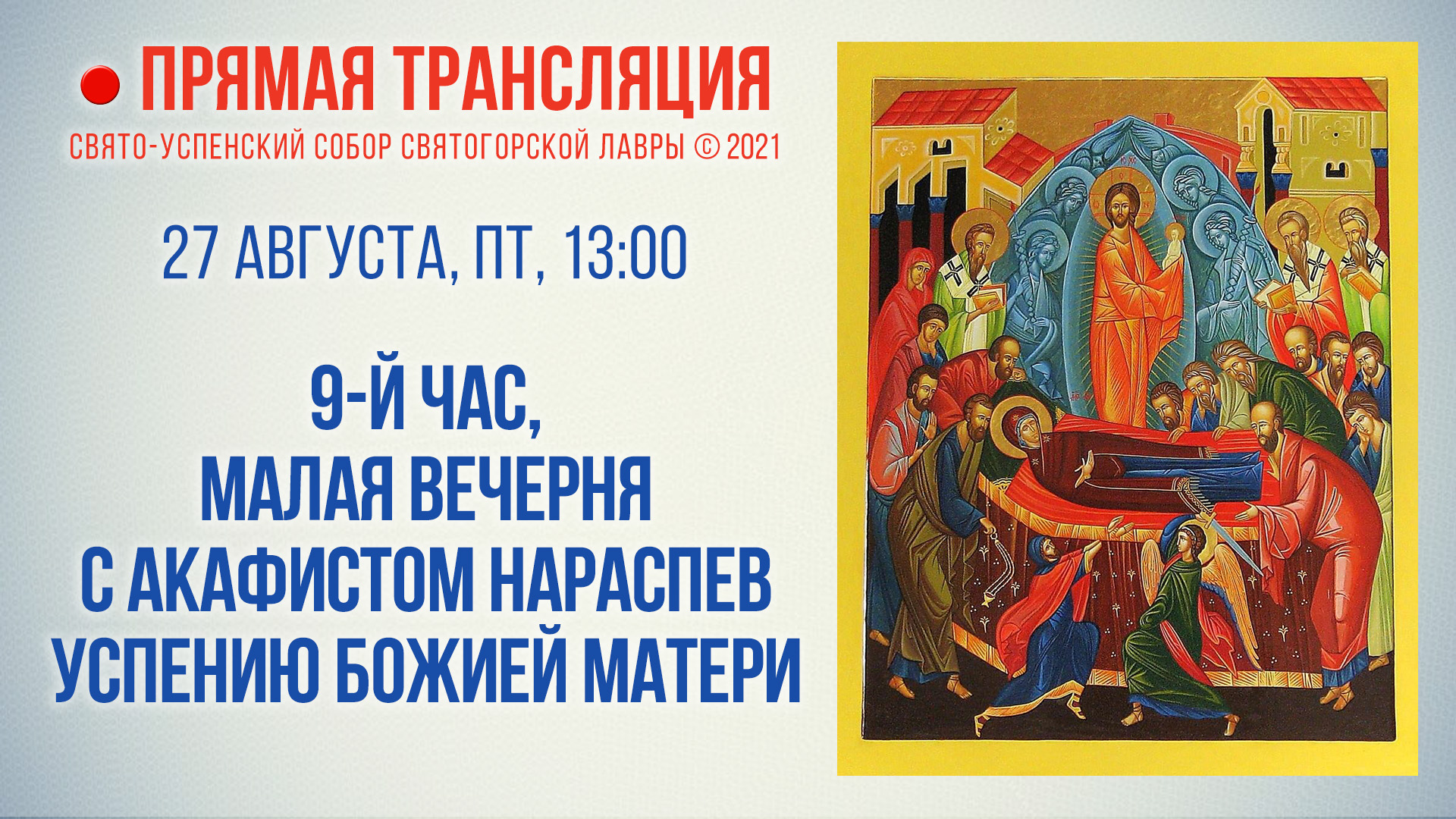 Прямая трансляция. 9-й час, малая вечерня с акафистом нараспев Успению Божией Матери 27.08.2021 г.