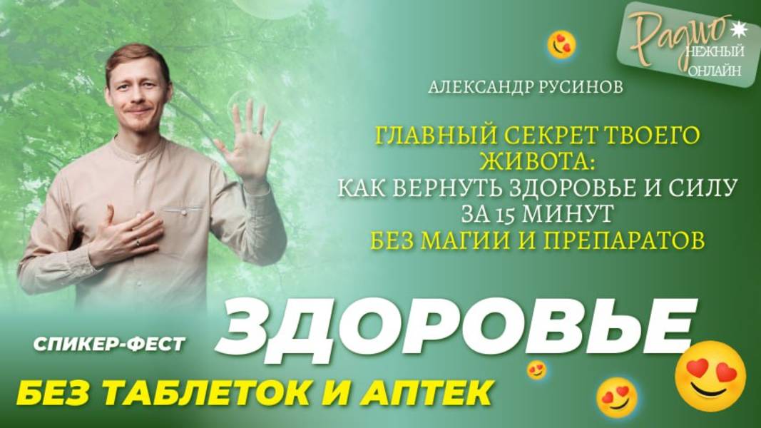 Главный секрет твоего живота: как вернуть здоровье и силу за 15 минут без магии и препаратов. Александр Николаевич Русинов: (https://t.me/rusinovkurs) Радио НежныйОнлайн https://t.me/nezny_online 🔸как хронический стресс и скрытые зажимы в теле «съедают» энергию и подрывают здоровье. 🔸почему именно живот — «второй мозг» человека и главный центр управления большинством процессов в теле. 🔸простая техника самоправления живота — как ежедневный инструмент, помогающий наладить гормональный фон, улучшить работу ЖКТ и укрепить иммунитет — без сложных схем, таблеток и анализов. Эфир проводит Александр Николаевич Русинов: (https://t.me/rusinovkurs) - Руководитель ЖИВА Центра НатуроПрактики в г.Москва, регулярно принимает подопечных и обучает специалистов в отрасли. - Автор Висцерально-Вибрационного и Диафрагмально-Вибрационного методов в НатуроПрактике. - НатуроПрактик и Целитель в 4-м поколении, носитель древних традиций Ладки, Правки Живота и Тела, Казачьей Здравы, восточной народной медицины. - Академик Европейской Академии Естественных Наук (ЕАЕН). - Председатель Профессиональной Ассоциации Специалистов Народной Медицины и Оздоровительных Практик «ПРОФНАРМЕД». ⭐️Созданное им объединение ЖИВА — единственная в РФ профессиональная организация в области НатуроПрактики. Регистрируйтесь и получайте подарки от наших экспертов! ⬇️⬇️⬇️⬇️⬇️ ЗАРЕГИСТРИРОВАТЬСЯ https://app.leadteh.ru/w/d3w2d ______________________________________ 🎙Если вы хотите стать спикером радио, попасть на подкаст, открыть свою передачу, пишите 👉 сюда https://t.me/m/sApQQFV0ZDgy