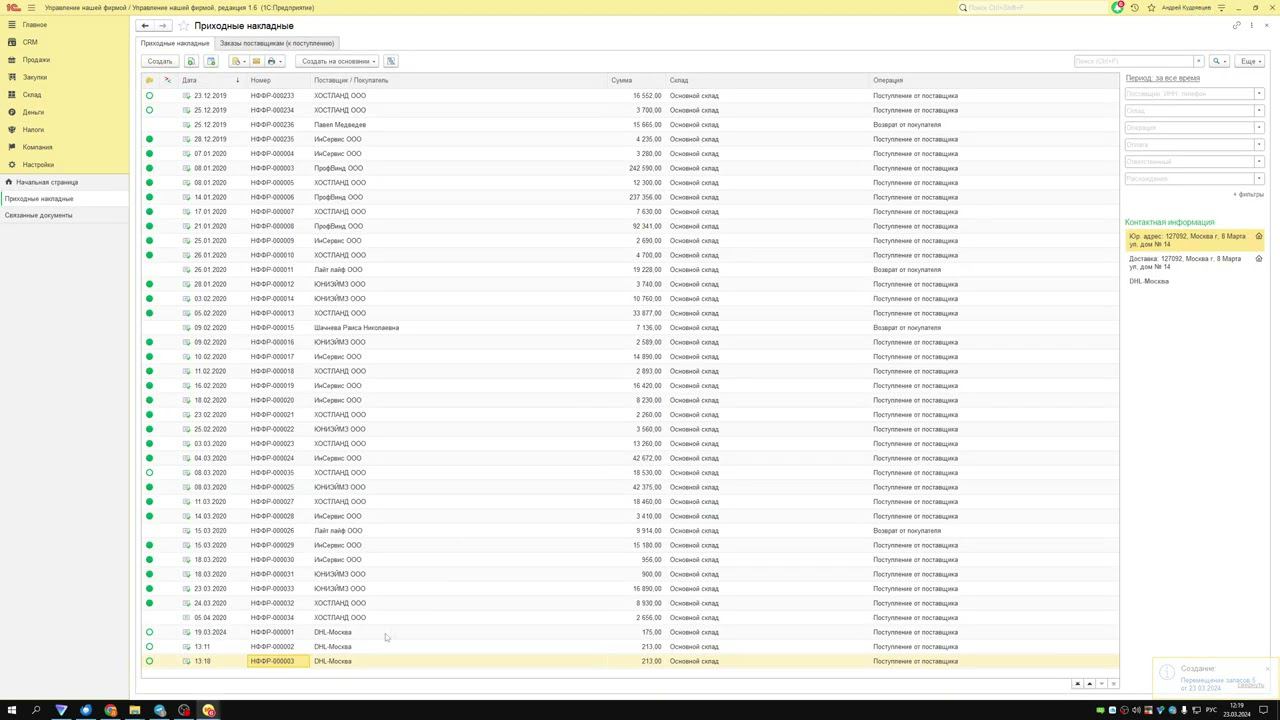 Контроль перемещений товаров при создании из поступлений для 1С