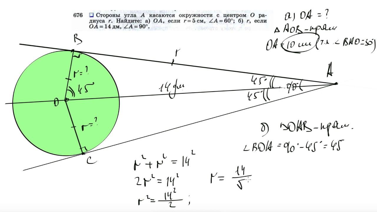 №676. Стороны угла А касаются окружности с центром О радиуса r. Найдите: а) ОА,