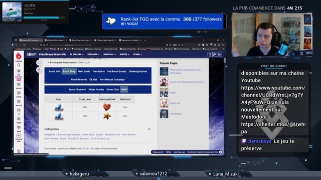 Le récapitulatif des évènements et bannières d'invocations sur la version Globale de Fate/Grand Order pour le mois de Février 2024. Ce mois-ci, un seul gros event nous tiendra occupé : la Saint-Valentin, qui vient avec l'unique nouveau Servant du mois : Bazett ! Un Servant prêt à mettre de grosses patates à quiconque tente de venir l'attaquer ! #fategrandorder #fgo #saintvalentine --------------------------- Vous pouvez me retrouver de temps en temps sur Twitch, où je stream notamment du Fate/Grand Order, mais aussi d'autres jeux selon les sorties du moment : https://www.twitch.tv/uwhipa Tous les replays sont disponibles sur cette chaine Youtube : https://www.youtube.com/channel/UCRdWrxLjv7g7YA4yF9uW--Q Et si vous voulez discuter de tout et de rien, vous pouvez rejoindre le serveur Discord : https://discord.gg/cxzctuPfxA J'ai aussi un compte Mastodon dorénavant : https://shelter.moe/@Uwhipa --------------------------- Ma config : CPU : AMD Rysen 5 3600XT 4.44GHz (6 coeurs) (Watercooling Corsair) Carte mère : Gigabyte B450 AORUS ELITE V2 RAM : 16 Go DDR4 1.06Ghz GPU : NVIDIA GeForce 2070 SUPER SSD : SamsungSSD860QVO1TB de 931.51 Go SATA III & SamsungSSD840Series de 111.79 Go SATA III Boitier : Enermax Makashi MK II Clavier : SteelSeries ApS SteelSeries Apex 150 Souris : Zelotes T80 1000-5500 DPI Ecrans : AOC 24G1WG4 1920*1080 & Acer EK240Y 1920*1080 Tapis de souris : Razer Overwatch Caméra : Razer Kiyo Pro Micro : HyperX Quadcast S --------------------------- Design des scènes de stream : Own3d.tv - Alpha Gaming Series Premium --------------------------- Un grand merci à NakaiiEbi pour la photo de profil : https://www.instagram.com/nakaiiebi/