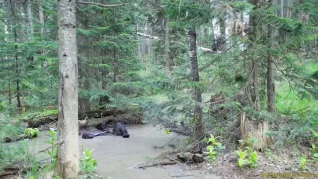 В фотоловушки на «Столбах» попали водные процедуры медведя. В такую погоду зверю приходится не легко из-за большого количества кровососущих насекомых. Звери активно посещают даже обмельчавшие и начинающие пересыхать водоемы.
