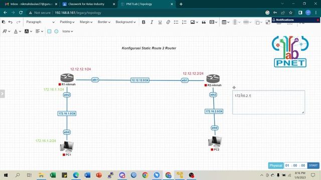 Lab 4.1 ini kita membahas tentang routing static dengan dua router. Bagaimana mengubungkan dua router dengan network yang berbeda.