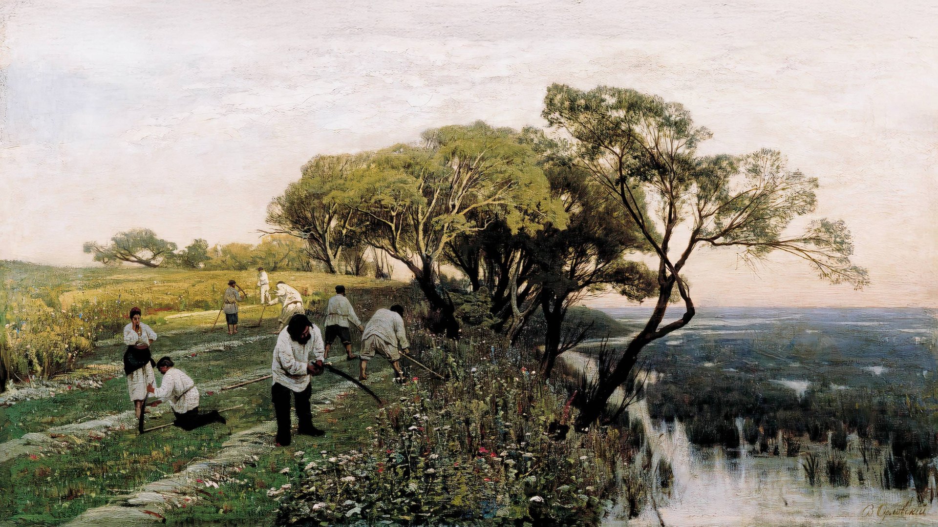 Орловский Владимир Донатович (1842–1914) Российский и украинский художник-пейзажист. Ученик А. П. Боголюбова, автор многочисленных работ, выполненных в Москве и Санкт-Петербурге для императорской четы Александра III. Родился в дворянской семье украинского происхождения. Начальное художественное образование получил во Второй киевской гимназии у И. М. Сошенко. Позже переехал в Петербург, поступил в Императорскую академию художеств в класс А. П. Боголюбова. В 1863 году Владимир Орловский был награждён Большой серебряной медалью академии. В 1868 году художник окончил академию с Большой золотой медалью и званием художника 1-й степени, что давало право на поездку за границу за казённый счёт. С 1869 по 1872 годы Владимир Орловский провёл в Европе: учился и работал в Италии, Швейцарии, Германии и Франции. В 1874 году Владимир Донатович был удостоен звания академика, в 1878 году — профессора Императорской академии художеств. Ещё через два года художника избрали в члены Совета Императорской Академии художеств. Орловский много работал по заказам императорской семьи, аристократии Петербурга и Москвы. Некоторые картины Владимира Орловского: «Закат над рекой. Рыбаки» (вторая половина XIX века) — Сочинский художественный музей; «Пахота на волах» (1886 год) — Сочинский художественный музей; «Привал охотников в лесу белого бука» (1882); «Облака над морем» (1885); «Пасмурный день» (1889); «Костёр в поле» (1872 год) — Государственный музей искусств Республики Казахстан им. Абылхана Кастеева, Алма-Ата; «Город Поццуоли близ Неаполя» (1876 год) — Государственная Третьяковская галерея, Москва; «Отдых в степи» (1884 год) — Харьковский художественный музей, Украина; «Унесённый баркас» (1887 год) — Костромской музей изобразительных искусств. Произведения Орловского находятся во многих музейных собраниях, в том числе в Государственной Третьяковской галерее, Научно-исследовательском музее Российской Академии художеств, Государственном музее украинского изобразительного искусства в Киеве и других. В.Д. Орловский продолжает впечатлять своим мастерством в изображении природы и сельской жизни. Его работы наполнены деталями, которые передают атмосферу спокойствия и умиротворения. В его картинах можно увидеть разнообразные сцены, от прибрежных пейзажей и закатов над рекой до сельских сцен с работающими людьми и животными. Орловский умело использует свет и тени, чтобы создать яркие и теплые образы природы. Его картины часто включают элементы сельской жизни, такие как коровы, лошади, телеги и фигуры людей, что добавляет живости и динамики его работам. Он также уделяет внимание сезонным изменениям, изображая как летние, так и осенние сцены, что позволяет зрителю почувствовать разнообразие и богатство природы. Его пейзажи часто включают элементы, такие как тропинки, мосты, телеги и фигуры людей, что добавляет живости и динамики его работам. Орловский также уделял внимание сезонным изменениям, изображая как летние, так и зимние сцены, что позволяет зрителю почувствовать разнообразие и богатство природы. Некоторые картины Владимира Орловского: «Закат над рекой. Рыбаки» (вторая половина XIX века) — Сочинский художественный музей; «Пахота на волах» (1886 год) — Сочинский художественный музей; «Привал охотников в лесу белого бука» (1882); «Облака над морем» (1885); «Пасмурный день» (1889); «Костёр в по