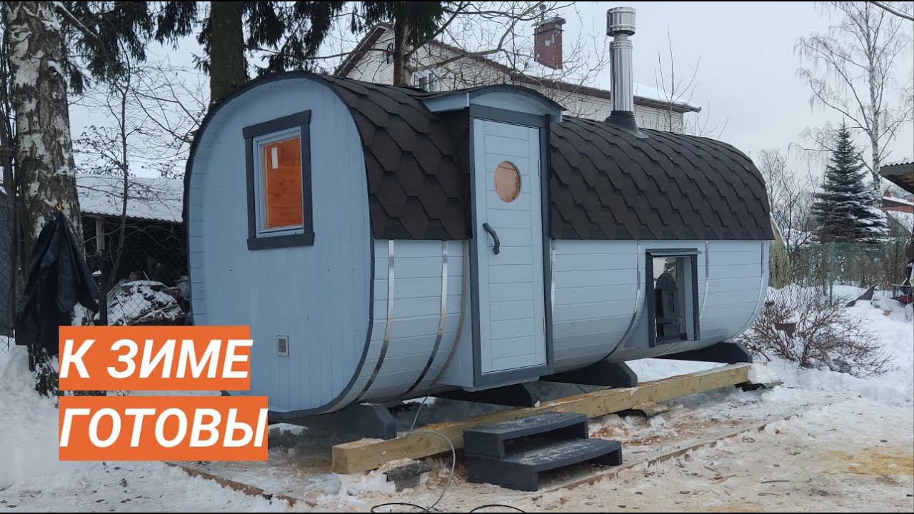 Вот такая симпатичная банька у нас получилась. Размер 2,3 на 5 метров, вход сбоку, топка вынесена на улицу. Уверен, что эта зимняя красавица прослужит своим владельцам долгие десятилетия.