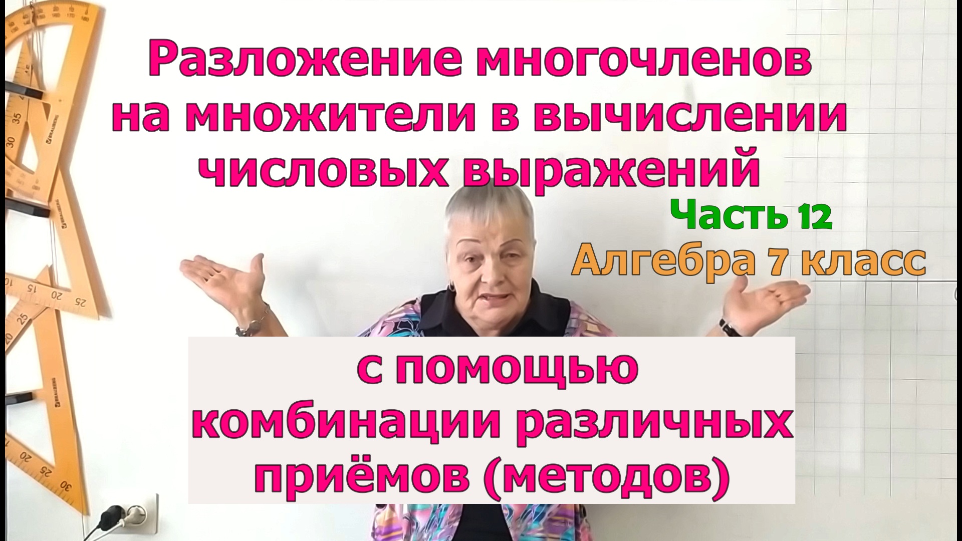 Алгебра 7 класс. Как найти значение числового выражения рациональным способом с помощью разложения многочленов на множители? Сегодня, продолжая говорить о разложении многочленов на множители, мы ответим на этот вопрос. На примере 6 упражнений мы подробно объясним Вам, как найти значение числового выражения с помощью разложения многочленов на множители. План урока и ссылки на предыдущие уроки Вы можете найти в описании под видео. 00:00 Начало видео. 00:43 Упражнение 1. 04:09 Упражнения 2 и 3. 07:07 Упражнение 4. 11:57 Упражнение 5. 15:00 Упражнение 6. Если Вы впервые на нашем канале или не смотрели предыдущие уроки, то рекомендуем Вам посмотреть следующие видео: Разложение многочленов на множители с помощью комбинации различных методов. Часть 11. Алгебра 7 класс. https://rutube.ru/video/9575ed8039138faded3cb23a08583197/ Разложение многочленов на множители по формулам сокращенного умножения (суммы кубов и разности кубов). Часть 10. Алгебра 7 класс. https://rutube.ru/video/da5aa5290307c70ab22a9c5c412a6b68/ Разложение многочленов на множители по формулам сокращенного умножения (квадрата суммы и квадрата разности). Часть 9. Алгебра 10-11 класс. https://rutube.ru/video/c74da7a4f2a13ffc00c19a969d597f78/ Разложение многочленов на множители по формулам сокращенного умножения (квадрата суммы и квадрата разности). Часть 8. Алгебра 9 класс. https://rutube.ru/video/842621ac145cd341796d02794fd1c845/ Разложение многочленов на множители по формулам сокращенного умножения (квадрата суммы и квадрата разности). Часть 7. Алгебра 7 класс. https://rutube.ru/video/63b28750459aa583eb525c7086a4ff39/ Разложение многочленов на множители по формулам сокращенного умножения (разности квадратов). Часть 6. Алгебра 8-11 класс. https://rutube.ru/video/fb2b71b55629739c9fcfe3dd41f51c0c/ Разложение многочленов на множители по формулам сокращенного умножения (разности квадратов). Часть 5. Алгебра 7 класс. https://rutube.ru/video/97a3410dd67f08691a3b148db5470edc/ Что такое разложение многочленов на множители. Как разложить одночлен на множители. Алгебра 7 класс. https://rutube.ru/video/e8012f424fccab7e8fc5e2506d4c7043/ Как вынести общий множитель (одночлен) за скобки. Разложение многочленов на множители. Часть 2. Алгебра 7 класс. https://rutube.ru/video/6d0a0ce6953e9a62a7dc0150ad3c1592/ Как вынести общий множитель (многочлен) за скобки. Разложение многочленов на множители. Часть 3. Алгебра 7 класс. https://rutube.ru/video/0e8aff292a37999c69c4a5831d4db654/ Разложение многочленов на множители. Способ группировки. Часть 4. Алгебра 7 класс. https://rutube.ru/video/614f1f9034150f4a7d271256ec96f6c7/ Алгебра 7 класс. Формулы сокращенного умножения. Разность квадратов двух выражений. Примеры упражнений. Урок 2 из 5. https://rutube.ru/video/077de8010f04048a811f020e83592df8/ #РазложениеМногочленовНаМножители #вычислитезначениечисловоговыражениярациональнымспособом #числовыезначениярациональныхвыражений #вычислитезначениечисловоговыражения #числовоезначениевыражения7класс #МатематикаОтБаканчиковой Алгебра 7 класс, разложение многочленов на множители 7, значение числового выражения с помощью разложения многочленов на множители, значение числового выражения 7, найдите значение числового выражения 7, вычислите значение числового выражения рациональным способом, числовое значение выражения 7 класс, найти значение числового выражения
