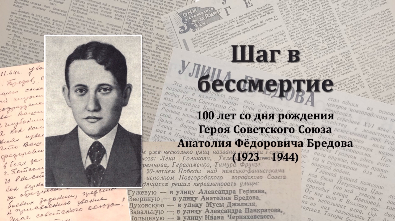 Виртуальная выставка «Шаг в бессмертие: 100 лет со дня рождения Героя Советского Союза Анатолия Фёдоровича Бредова (1923 – 1944)» На выставке представлены книги, статьи из новгородских газет из фондов Новгородской областной универсальной научной библиотеки о Герое Советского Союза, командире пулемётного отделения 155-го стрелкового полка 14-й стрелковой дивизии 14-й армии Карельского фронта. Анатолий Фёдорович Бредов родился в Новгороде. В 1930-е годы семья переехала в Мурманск. По окончании 7-ми классов Анатолий Фёдорович работал электриком на Мурманской судоверфи. Когда началась война, хотел пойти на фронт, но получил бронь: верфи требовались специалисты. С апреля 1942 года был призван в действующую армию. Служил командиром пулёметного отделения 155-го стрелкового полка 14-й стрелковой дивизии 14-й армии Карельского фронта. В ходе Петсамо-Киркенесской операции 11 октября 1944 г. его полк вышел на автодорогу Петсамо (Печенга) – Титовка (Мурманская область) и начал штурм высоты Придорожная. Пулемётный расчет Бредова выдвинулся вперед и уничтожил 80 немцев. Вскоре пулемётная точка была обнаружена и окружена немецкими войсками, которые подвергли её массированному обстрелу. В живых остались лишь командир Бредов и наводчик Н. Е. Ашурков. Патроны закончились, и бойцы стали кидать в гитлеровцев гранаты. Последней оставшейся гранатой Бредов и Ашурков подорвали себя и пулемет (Ашурков остался жив). Воины 155-го стрелкового полка, воодушевившись подвигом пулеметчиков, заняли высоту Придорожную. 24 марта 1945 г. Анатолию Бредову было присвоено звание Героя Советского Союза посмертно. Он похоронен на воинском кладбище Мурманска. Именем Героя названа улица в Великом Новгороде, установлена в его честь мемориальная доска. Справки по телефону: 8 (8162) 77-37-88 – отдел краеведения.
