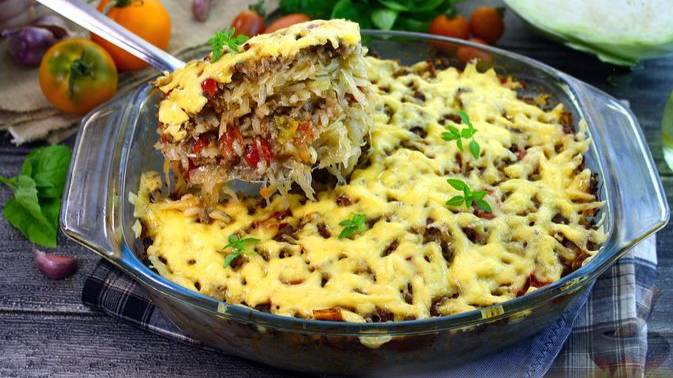 Запеканка готовится на основе свежей капусты. Сочный фарш, обжаренный с томатами и отварной рис отлично дополняют капусту. А слой расплавленного сыра сверху не только выглядит аппетитно, но и добавляет замечательную сырную корочку.
