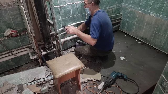 Убираем кафель в санузле. Делаем стеллажи в котельной. Делаем тёплый пол.