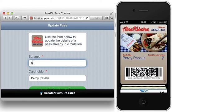 This video http://youtu.be/ieUW_Fw5Xs4 shows you how to quickly and easily experience Passbook Push Updates with PassKit. To get a free PassKit Account and to be able to quickly and easily create passbook passes today simply go to http://create.passkit.com and register. In a production environment you or your systems would update the pass once it has been used or you have received a top-up payment. 1. Open Safari in your iPhone or iPod Touch (with the latest Operating System installed iOS6) 2. Go to http://PassKit.com 3. Scroll down to the sample passes 4. Select the AbraKebabra Pass 5. Tap the Add to Passbook Button 6. Enter your name and email address in the text fields. (The email address is for Pass recovery, should you lose your phone or accidentally delete the Pass. This comes as a standard feature on all PassKit Passes so your customers have complete peace of mind). 7. Tap the Add to Passbook Button 8. And then when the Pass is displayed in your phone, tap the Add Button (in the top right hand corner) 9. Come back to your Home Screen and open the Passbook app 10. Choose the AbraKebabra Pass 11. Using a 2D Barcode scanner connected to your computer, scan the Passbook barcode (you'll need to make sure that the barcode scanner can read PDF417 barcodes in this example) 12. The Pass Update URL will appear in the browser (the scanner acts like a typewriter, and the Pass Update URL is encoded in the Pass barcode) 13. Type the Password (which is 123) 14. Left mouse click the Access Pass button 15. Enter a new balance (this can be anything you like... just make sure it's a different number to the current balance) 17. Left mouse click Update Passbook Pass 18. Now lock your phone 19. In a few seconds, you will receive a lock screen message 20. Swipe the icon from left to right and your updated Passbook Pass will appear and the new balance is circled. If you want to use the AbraKebabra Pass Template as a starting point for your own Pass designs simply click Edit Pass Template and it will load up in the Pass Designer You can then customise for your own business. You can change the colours, images, content etc.. Note that '%u' inserts the Pass Update URL on the back of the Pass or encode in the barcode when the Pass is created Once you have made the Pass look and feel how you want it for your business, remember to Save the Pass and the Pass Template will be saved to your PassKit Account If you are not logged into your PassKit Account at the time then you'll be prompted to login or register. To get the most out of Passbook: - Subscribe to our YouTube channel - Like us on Facebook: http://facebook.com/pkpass - Follow us on twitter: http://twitter.com/passkit - Join in the discussion: http://forum.passkit.com