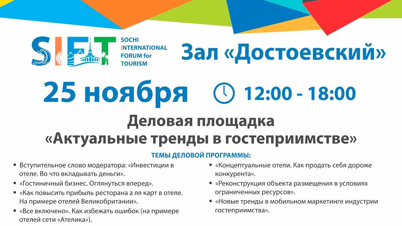 Деловая площадка «Актуальные тренды в гостеприимстве» Модератор: Вадим Прасов, вице-президент Федерации рестораторов и отельеров, генеральный директор «Альянс Отель Менеджмент». Вступительное слово модератора: «Инвестиции в отеле. Во что вкладывать деньги». Спикер: Вадим Прасов, вице-президент Федерации рестораторов и отельеров, генеральный директор «Альянс Отель Менеджмент». Тема: «Гостиничный бизнес. Оглянуться вперед». Спикер: Анастасия Крумина, эксперт гостиничного бизнеса, операционный директор сети хостелов «Заходи». Тема: «Как повысить прибыль ресторана а ля карт в отеле. На примере отелей Великобритании». Спикер: Вероника Скурихина, руководитель Департамента повышения качества обслуживания, Центр развития туризма Республики Татарстан, г. Казань. Тема: «Все включено». Как избежать ошибок (на примере отелей сети «Ателика»). Спикер: Алексей Высоканов, руководитель УК «АТЕЛИКА». Тема: «Концептуальные отели. Как продать себя дороже конкурента». Спикер: Антон Басин, УК «Фанталис». Тема: «Реконструкция объекта размещения в условиях ограниченных ресурсов». Спикер: Андрей Волохов, управляющий партнер VAPconsulting. Тема: «Новые тренды в мобильном маркетинге индустрии гостеприимства». Спикер: Александр Бейкер, директор по маркетингу и продажам компании Hotel Remote Control. Место проведения: зал «Достоевский» Международный туристский форум в Сочи SIFT-2016 http://tour-forum.com/