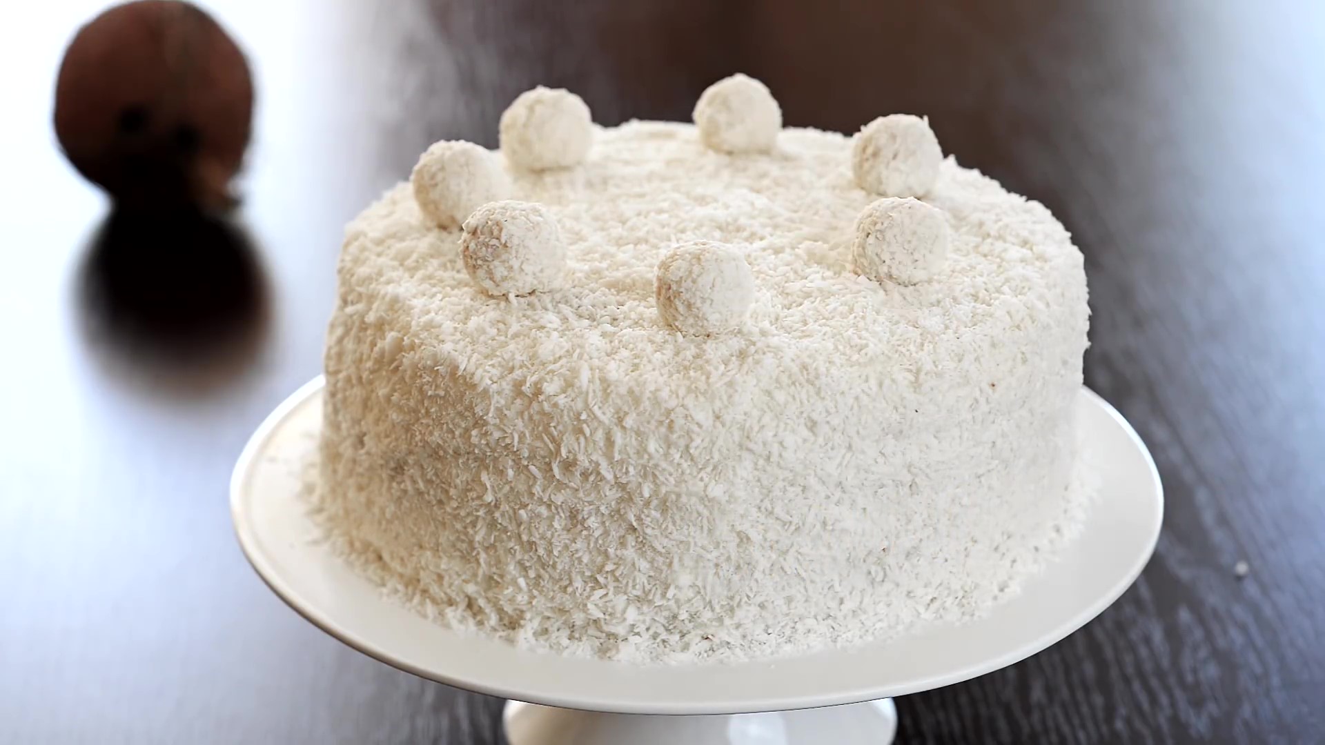 Ингредиенты: Для бисквита: Яйца «комн. темп.» — 7 шт. Сахар — 200 г. Мука — 140 г. Картофельный крахмал — 50 г. Ванильный экстракт — 1 ч.л. Соль — 2 г. Для крема: Сливочный сыр маскарпоне «комн. темп.» — 500 г. Сливки 33-35% — 300 мл. Белый шоколад — 200 г. Кокосовая стружка — 70 г. Сахарная пудра — 50 г. Для пропитки: Кокосовое молоко — 150 мл. Для начинки и украшения: Миндаль очищенный — 70 г. Кокосовая стружка Конфеты Рафаэлло 1. Разогреть духовку до 180 °С. Дно формы для выпечки застелить пергаментной бумагой. 2. Приготовить бисквит. Отделить белки от желтков. К белкам добавить соль, и взбить миксером до мягких пиков. Постепенно добавить сахар и продолжать взбивать до крепких пиков. 3. В небольшой миске смешать яичные желтки с ванильным экстрактом и добавить их во взбитые белки. 4. Постепенно добавить картофельный крахмал и муку, аккуратно перемешать тесто. 5. Вылить тесто в подготовленную форму диаметром 24 см. 6. Выпекать в течение 30-35 минут. Готовность бисквита можно проверить деревянной шпажкой, если при прокалывании она выходит чистой из бисквита — значит он готов. 7. Вынуть из духовки и дать остыть в течение 10 минут. Затем бисквит вынуть из формы и дать полностью остыть на решётке. 8. Приготовить крем. В миске соединить белый шоколад и 50 мл. сливок. Растопить на водяной бане. 9. В большой миске взбить сыр маскарпоне «комнатной температуры» до однородной массы. Добавить растопленный шоколад и перемешать до однородности. 10. В другой миске взбить 250 мл. сливок до крепких пиков. Добавить сахарную пудру. 11. В сырную массу постепенно добавить взбитые сливки. В готовый крем добавить кокосовую стружку и осторожно перемешать. 12. Полностью остывший бисквит разрезать на 3 части. Положить первый корж на подставку для торта. 13. Пропитать корж 50 мл. кокосового молока. Затем выложить 1/3 крема и посыпать орехами. Выложить второй корж, пропитать кокосовым молоком, смазать кремом и посыпать миндалем. Выложить последний корж, пропитать кокосовым молоком и покрыть оставшимся кремом, вверх и бока торта. 14. Обсыпать торт кокосовой стружкой. Убрать торт в холодильник на 5-6 часов для пропитки. 15. Украсить по желанию, я использовала конфеты «Рафаэлло».