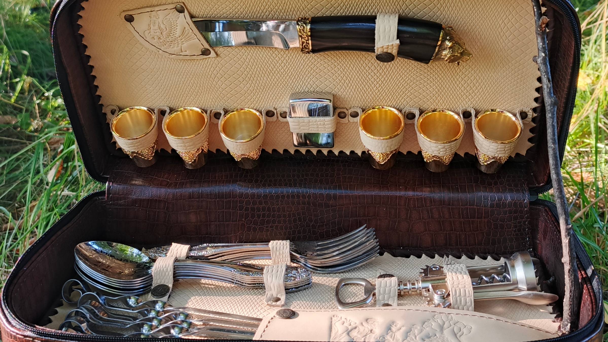 Удобная компактная барсетка-чемоданчик со столовыми приборами на 6 персон и необходимыми мелочами - то, что нужно для комфортного загородного отдыха. Прекрасный подарок для мужчины, мужа, охотника или рыбака! Комфортно отдохнуть с друзьями, родственниками или деловыми партнёрами Вам поможет этот подарочный набор для пикника. Изготовлен из качественного и прочного кожзаменителя. Набор не занимает много места в машине и удобен в переноске. Барсетка с наружи выполнена из экокожи. Картинка с наружи нарисована на светлой натуральной кожи, лазером. Нутро борсетки выполнено, из натуральной кожи, с элементами горячего тиснения. Редкость, лазерный рисунок по коже. Комплектация: 1) Нож Турист с рукоятью, из американского твёрдого дерева венге или граб и литой накладкой с изображением зверя. 2) Рюмочки Розенберг с посеребрением - 6 шт. 3) Зажигалка Зип - 1 шт. 4) Ложки - 6 шт. 5) Вилки - 6 шт. 7) Штопор - 1 шт. 8) Шампура 35 см из пищевой нержавейки 1,5 мм. - 6 шт. 9) Транспортировочная упаковка (пузырьковая пленка или подложка НПЭ из вспененного полиэтилена 2мм) - 1