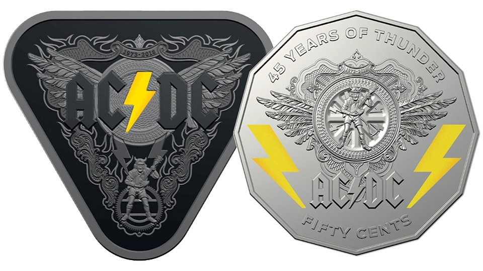 2 монеты Австралии 45 лет группе AC/DC.