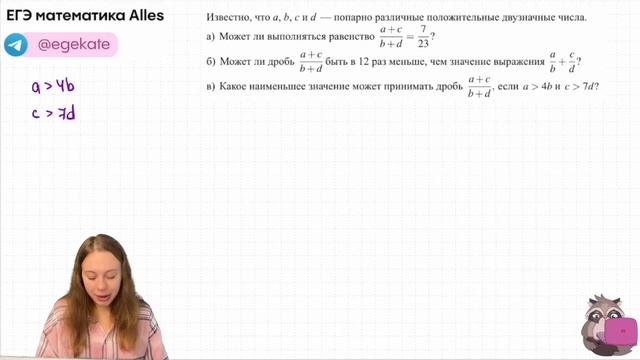 Конспекты и методички в тгк: https://t.me/+aj9nPXEzHYw1Nzky Годовой курс "Экспонента": - авторская программа - 3 урока в неделю по 2 часа онлайн - дз и разборы - устные зачеты - ежемесячные пробники Жду тебя! звестно, что а, b, с и d — попарно различные положительные двузначные числа. а) Может ли выполняться равенство a+c/b+d=723? 6) Может ли дробь a+c/b+d быть в 12 раз меньше, чем значение выражения: a/b+c/d? в) Какое наименьшее значение может принимать дробь a+c/b+d, если а больше 4b и с больше 7а?
