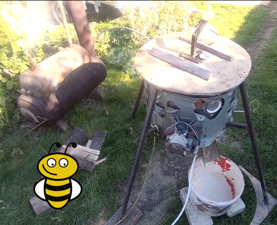Вытапливаю остатки пчелиного воска из мервы (пасечных вытопок). Топлю с помощью самодельного парогенератора и центрифуги. Делаю так уже не первый год. Мне нравится. Топить можно не только мерву, но и старые пчелиные рамки, сушь.