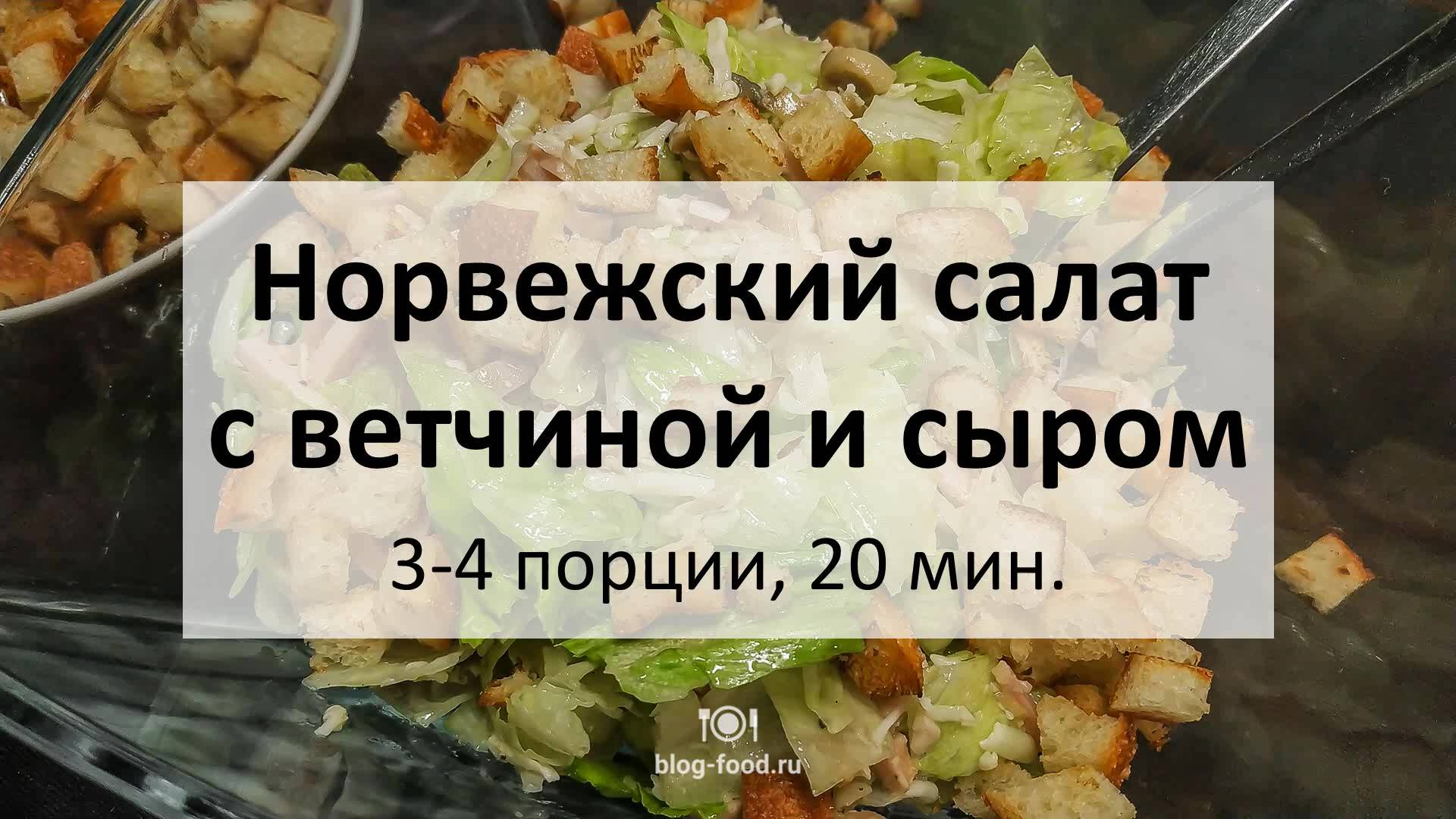 Всем привет. Сегодня перенесёмся на север и сделаем очень вкусный, хрустящий и звонкий зимний салат. Его прелесть в том, что мясная составляющая может быть какая угодно. Ветчина, буженина, копчёный окорок, даже варёная или жареная птица или мясо прекрасно сыграют свою роль в этом ансамбле. В оригинале используются сырые шампиньоны, но у нас завалялась банка консервированных, мы добавили их, что, к сожалению, понизило уровень блюда. Оригинальное прочтение, когда грибы чувствуются и не добавляют лишней влаги, действительно лучше, так что тут эксперименты неуместны )). • Ветчина, 300 гр. • Шампиньоны, 100 гр. • Салат айсберг, 172 кочана, • Сыр, 100 гр. • Растительное масло, 8 ст. л. • Лимонный сок, 2 ст. л. • Сахар, 1 ч. л. • Горчица, 1 ч. л. • Чеснок, 1 зубец • Хлеб на сухарики • Соль Хлеб режем ломтиками, натираем чесноком, нарезаем кубиком. Ветчину режем соломкой, сыр натираем на крупной тёрке. Сырые шампиньоны тщательно моем, нарезаем соломкой или тонкими пластинами. Хлеб обжариваем на сливочном масле до хрустящей корочки. Присаливаем в процессе. Растительное масло, лимонный сок, сахар и горчицу взбалтываем венчиком до однородности. Салат рвём руками, складываем в миску, заправляем, перемешиваем, досаливаем по вкусу. Подаём с сухариками. Приятного аппетита! Читать на сайте с картинками: https://blog-food.ru/1217