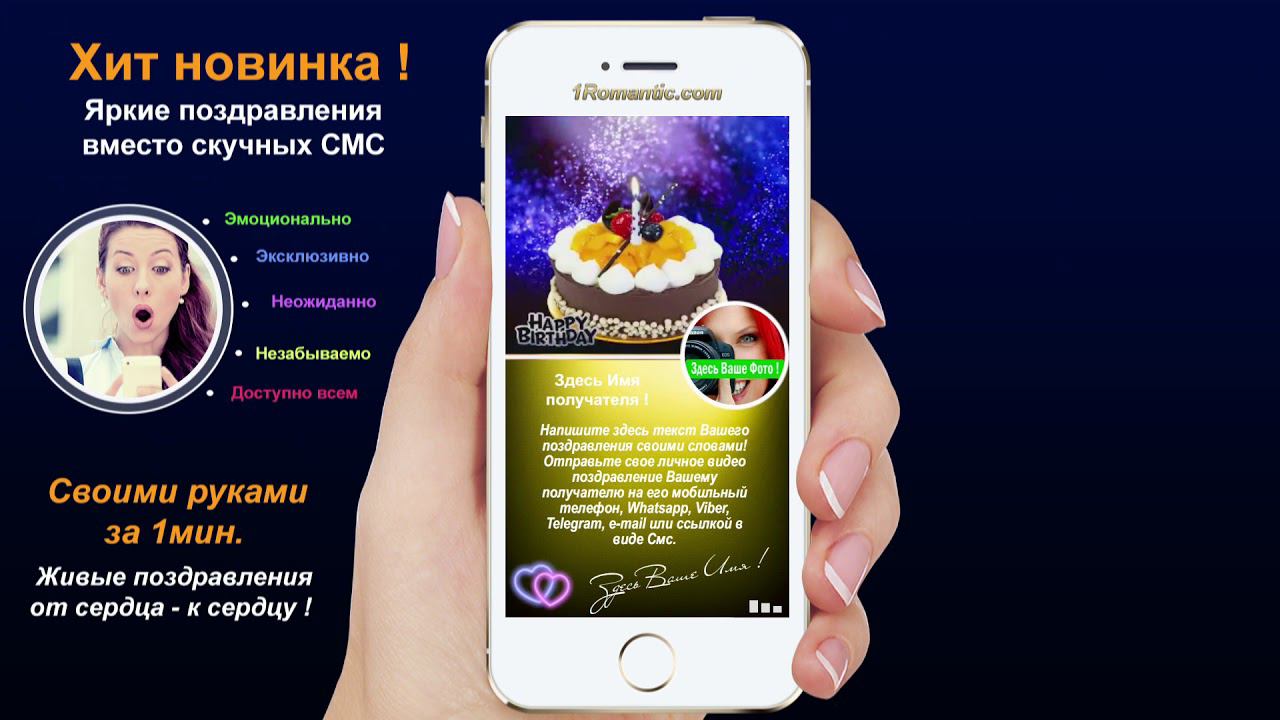 ЗАПОЛНИТЬ ЭТУ ОТКРЫТКУ СЕЙЧАС: https://1romantic.com/musicalnye-pozdravleniya/zhelayu-tebe/ Дорогие друзья! Вам остаётся только, написать нужный вам текст и загрузить свою фотографию. 1Romantic.com Является первым и единственным в мире сервисом интерактивных видео поздравлений. Мы используем собственную уникальную технологию, добавляя ежедневно самые новые и последние разработки программирования. У нас Вы можете найти поздравления на любой вкус, только высокого качества и разрешения. Согласитесь, всегда приятней, отправить поздравления от себя лично, чем пересылать чужие, с уже заготовленным стандартным и быстро мерцающим текстом, как рекламный баннер, пересылаемый друг-другу от тысячи к тысячам где нет Ваших Имён. Задумайтесь ! Это выглядит слишком наивно и как минимум глупо, особенно для людей которые умеют писать и читать (на мою розочку сверкалку или стикер и отвали). Теперь всё будет иначе ! Вы можете сами передать своё настроение, тем людям, которым Вы будете адресовать своё поздравление. Теперь Вы сами, творец, художник и поэт своих чувств, наполняя видео открытку своими словами, излучая только самое доброе, искреннее из своих тёплых сердец. Загрузить свою любимую фотографию или фотографию получателя, что безусловно, будет гораздо приятней и неожиданней для него) Безусловно, мы подумали и о музыкальном оформление. Наверняка, Вы будете подбирать нужные слова и фотографию под ту песню, которую Вы захотите загрузить сами, а не ту которую Вам навязывают. Ну и самое главное, Вы можете использовать функцию добавления своего голоса, программа сама наложит Ваш голос на начало загруженной песни. Поверьте это очень оригинально, особенно если Ваш друг не слышал Вас долгие годы. Такое поздравление можно сделать действительно за 30-60 сек. Но если Вы творческий человек, оно не отпустит Вас так быстро))) И Вы будете думать, сочинять, плакать, улыбаться, восхищаться, раскрыв в себе новые таланты... возможно это станет Вашим первым собственноручным творением . Удачи Вам ! С уважением, Ваши Романтики ! Краткий список предлагаемых нами поздравлений... Поздравления с днем рождения женщине. Поздравления с днем рождения мужчине. Поздравления с днем рождения другу. Поздравления с днем рождения подруге. Поздравления с днем рождения для детей. Поздравления с днем святого Валентина. Поздравления Папе. Поздравления с днем рождения Маме. Прикольные поздравления. Видео поздравления с днем рождения. Музыкальные поздравления с днем рождения. Слайд-шоу с днем рождения. и многое-многое другое.