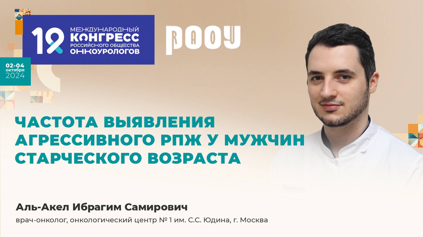 4 октября на XIX Международном Конгрессе РООУ Аль-Акел Ибрагим Самирович, представил доклад на тему: "Частота выявления агрессивного рака предстательной железы у мужчин старческого возраста". ✅ Эксперт: Аль-Акел Ибрагим Самирович, врач-онколог, онкологический центр № 1 им. С.С. Юдина, г. Москва ❗ ➡️ Официальный сайт РООУ: https://roou.ru/ Присоединяйтесь к нам в социальных сетях. Делитесь мнением и повышайте уровень теоретической и практической подготовки в онкоурологии: Telegram: https://t.me/oncologyurology ВКонтакте: https://vk.com/oncologyurology #РООУ #RAOU #ОбществоОнкоурологов #Онкоурология #Урология #Онкология #Oncourology #XVКонгрессРООУ #КонгрессРООУ #ракпочки #медицинскиеконференции #urology #OncologyUrology