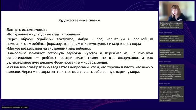 Сказкотерапия как инструмент развития детей с ОВЗ Дата проведения: 14.05.2025 Время: 12:00 МСК Венгер Екатерина Александровна: педагог-психолог, преподаватель психологии, стаж работы в психологической деятельности - 17 лет, активный участник международных, всероссийских, региональных научно-практических конференций, семинаров, акций, круглых столов. Сказкотерапия – это эффективный и деликатный метод работы с детьми с ОВЗ, позволяющий мягко корректировать эмоциональное состояние, развивать коммуникативные навыки и стимулировать познавательные процессы. Через сказочные истории дети учатся понимать и выражать свои чувства, справляться со страхами и тревогами, а также моделировать конструктивное поведение в различных ситуациях. Сказки помогают формировать позитивное отношение к себе и окружающему миру, развивают эмпатию и способствуют социальной адаптации детей с особенностями развития. Важно подбирать сказки, соответствующие возрасту и индивидуальным потребностям ребенка, а также использовать различные техники, такие как прослушивание, рассказывание, рисование и драматизация, чтобы максимально раскрыть терапевтический потенциал сказки. Этот метод позволяет корректировать эмоционально-волевую сферу, развивать моторику через разыгрывание сказок, а также учит находить решения в сложных ситуациях, формируя морально-нравственные качества. Наш портал «Педагоги России» — бесплатные вебинары: http://veb.pedrus.ru/ Приобрести сертификат можно тут: https://veb.pedrus.ru/zayavka/?id=1799