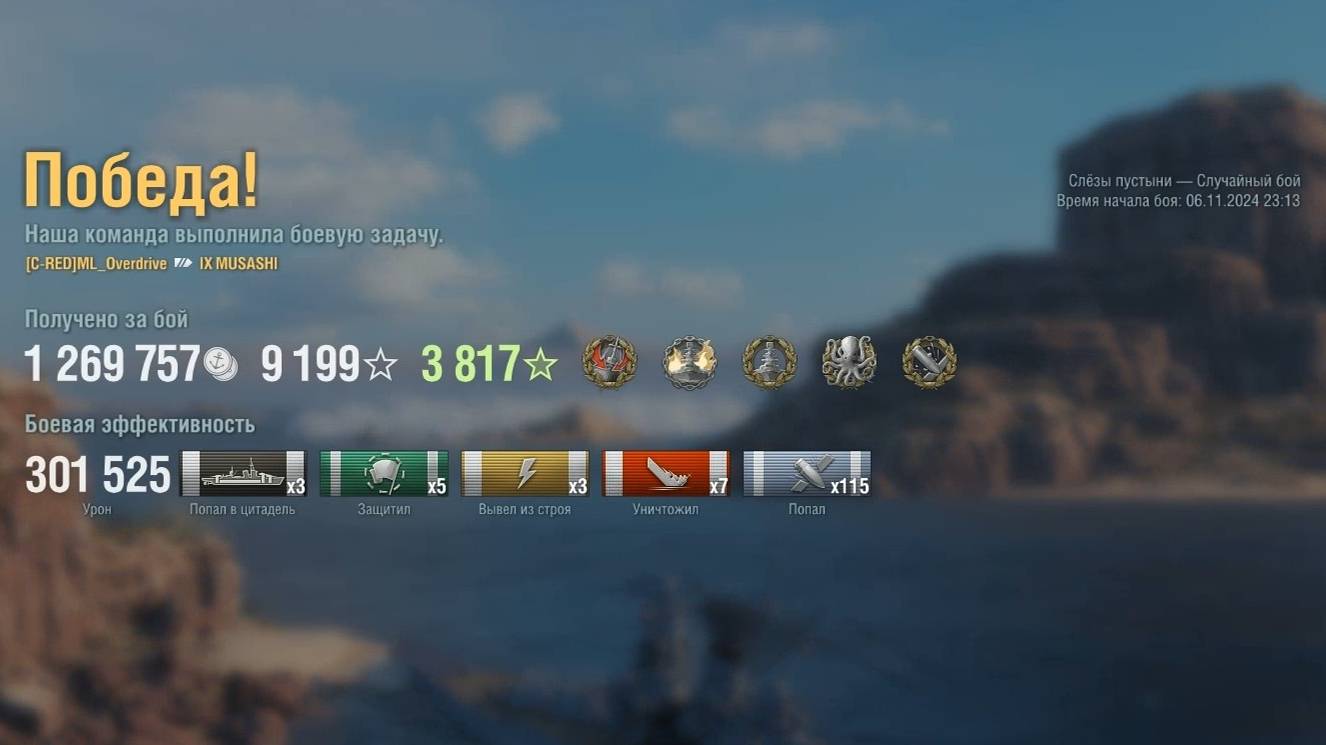 Линкор Musashi: +301к урона 7 фрагов на карте Слёзы пустыни - World of Warships