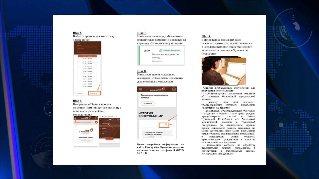«Цифровая экономика» наци проекчĕпе социаллă пулăшăва тивĕçекен çынсем юридици пулăшăвне тӳлевсĕр илме пултараççĕ. «ТелеМФЦ» çĕнĕ сервиспа усă курса çынсен хăйсен прависем пирки онлайн мелпе пĕлме май пур. Юридици пулăшăвне килтен тухмасăр илес текенсен патшалăх пулăшăвĕсем паракан пĕрлехи порталта регистрациленмелле. Онлайн пулăшăва илме нумай функциллĕ центр сайтне кĕмелле е QR-кодпа усă курмалла. Хăвăра кирлĕ уйрăма тупса вăхăтне тата кунне палăртмалла. Документсен электронлă копине кĕртмелле те палăртнă кун юристсемпе çыхăнăва тухмалла