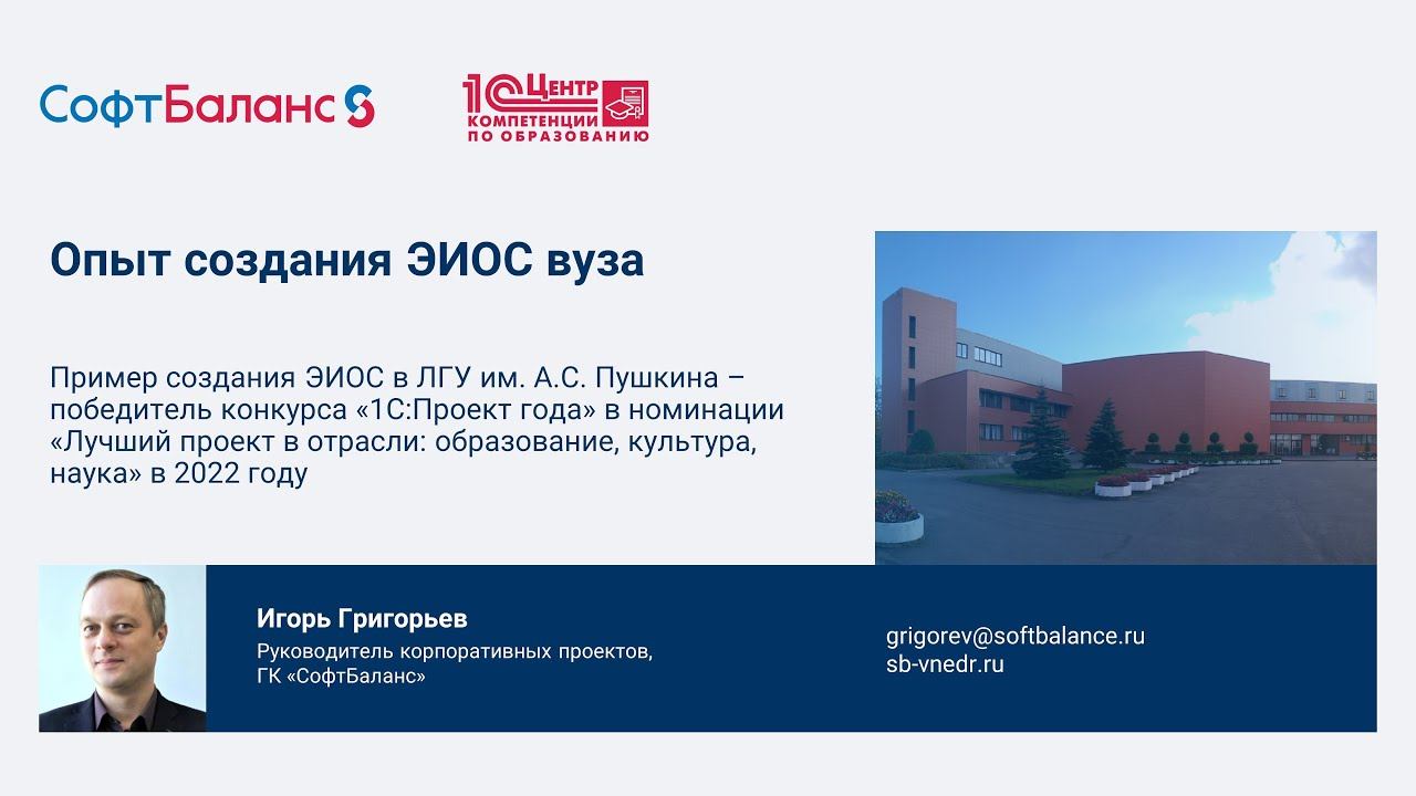 ГК "СофтБаланс" https://sb-vnedr.ru/ Опыт создания ЭИОС вуза Общий обзор автоматизации 9-ти университетов Пример создания ЭИОС в ЛГУ им. Пушкина - победитель конкурса "1С:Проект года" в номинации "Лучший проект в отрасли: образование, культура, наука" в 2022 году Внедрение 1С Университет https://sb-vnedr.ru/programm/1c-obrazovat/1c-universitet-prof/ Внедренные проекты в сфере образования https://sb-vnedr.ru/vnedrenie-1c/obrazovanie/ https://youtu.be/4ArmupTJMDs