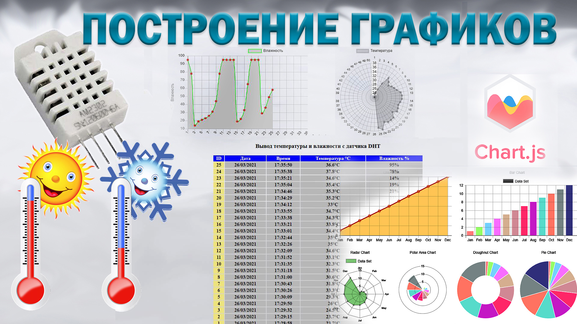 Построение графика погоды. chart js примеры видеоурок Сегодня рассмотрим построение графика погоды. Строить график будем с помощью chart js. Построение двух графиков будет осуществлено при помощи chart js примеров. Этот видеоурок про построение графиков по значениям взятым из базы данных MySQL. Рассказ про chart js на русском языке, описание, возможности использования, типы и другое. Скетчи используемые в видео можно скачать на сайте "Ардуино для начинающих". http://arduino-kid.ru./blog/postroenie-grafika-pogody-chart-js-primery-videourok