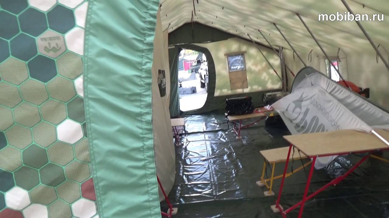 Р-75 армейская баня - именно так называли прохожие большую палатку с печью внутри. Большая отапливаемая двухслойная палатка. Зимняя палатка площадью 32 кв. м. Возможность для обогрева помещения двумя печами длительного горения Согра. А так же создание помывочно-банного отделения путём пристёгивания системы перегородок. Большой полевой лагерь и армейская баня - это палатка Роснар Р-75. Возможность эксплуатации в условиях Заполярья и в условиях степи или пустыни. Внутренняя перегородка на торце может быть отстёгнута для летнего режима. Когда жителей отделяет от окружающей среды москитная сетка. На видео снаружи видно, что расположено внутри сквозь перегородку из москитной сетки. http://mobiban.ru/r-75.php