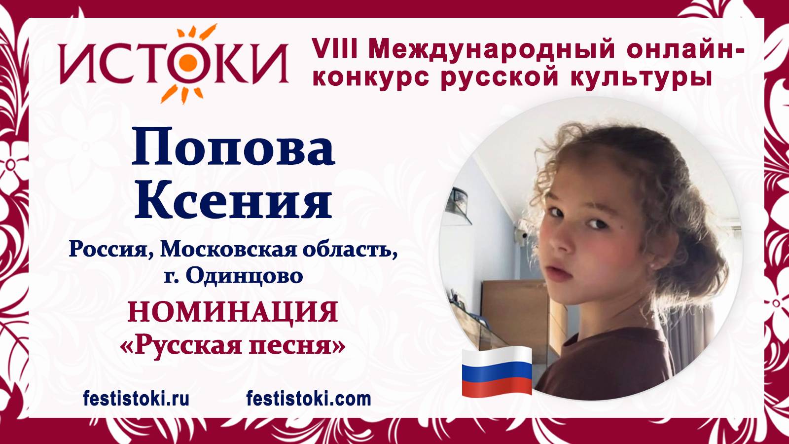 Участник VIII Международного онлайн-конкурса русской культуры "Истоки". Номинация "Русская песня". Народная песня "Реченька". Сайт: festistoki.ru / festistoki.com E-mail: festistoki@mail.ru