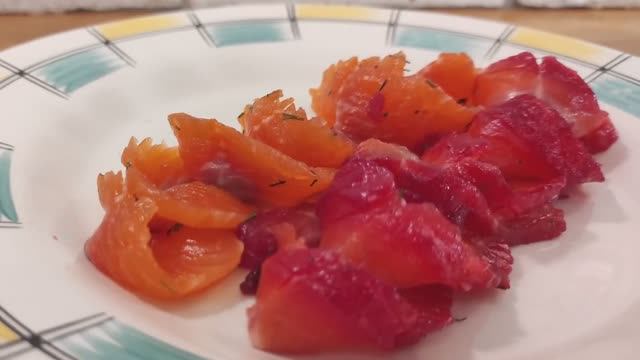 Цены на красную рыбку в магазине порой вызывают недоумение. Жемчугом, там ее кормят, что ли. Да и качество, во многом, "такое себе". Мы, для себя и своих гостей, уже давно солим рыбу по скандинавскому рецепту - Гравлакс (gravlax). Она получается в меру соленой, нежной и таящей во рту. Посолочная смесь Соль - 2 ст.л. Сахар – 1 ст.л. Перец душистый – 1 горошина Опционно: Укроп Отварная свекла Водка Разделайте или оттайте рыбу. Удалите жирное брюшко (тешу), её потом можно использовать для приготовления бульона или засолить, и чуть подвялить, отдельно, будет отличная закуска к пенному. Удалите пинцетом, по возможности, все кости. Разделите филе на две половины и положите, в заранее приготовленную емкость для маринования. Приготовьте посолочную смесь: смешайте соль, сахар и раздавленный душистый перец. Укром нашинкуйте. Свеклу натрите на крупной терке. Присыпьте рыбу с двух сторон, кожу чуть больше, посолочной смесью. Не переборщите. Она должно слегка покрывать рыбу. Добавьте укроп или свеклу между кусками филе .Отправьте в холодильник на 10-16 часов в зависимости от толщины рыбы. Если во время засолки, а такое часто бывает если рыба была заморожена, будет выделяться влага, то ее стоит 2-3 раза перевернуть. Промывать рыбу не нужно, просто удалите лишние укроп и свеклу, нарежьте и наслаждайтесь отменным блюдом, рецепт, которого нам подарили суровые Викинги. #Слабосоленаярыба #Слабосоленаяфорель #Краснаярыба #Засолкарыбы #Мужикиуплиты
