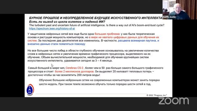 Что может PANN? — Борис Злотин Семинар русскоязычного сообщества AGI 9 декабря 2021 https://omega-server.ai/ https://t.me/agirussia/26283 https://agirussia.org/ Мы ведем группы и организуем семинары русскоязычного сообщества разработчиков систем AGI (Artificial General Intelligence или Общий Искусственный Интеллект) или Strong AI (Сильный Искусственный Интеллект), а также - являющийся их частным случаем HLAI (Human-Level Artificial Intelligence или Искусственный Интеллект Человеческого Уровня). Группы: https://t.me/agirussianews (новостной канал) https://t.me/agirussia (основная) https://t.me/agiterms (вопросы терминологии) https://t.me/agibots (разговорный интеллект) https://t.me/agifintech (финансовые технологии) https://t.me/collectivei (коллективный интеллект) https://www.facebook.com/groups/agirussia (основная) https://www.facebook.com/groups/socialintelligence (коллективный интеллект) https://groups.google.com/g/agirussia Онлайн-семинары идут по четвергам, в 18:00 по Московскому времени. Продолжительность два часа, обычно это либо доклад на один-полтора часа и последующее обсуждение на полчаса-час либо круглый стол с регламентом на усмотрение модератора дискуссии. Технические средства проведения, регламент и модерацию обычно обеспечивает инициатор конкретного семинара либо спикер и его коллеги. Регистрация на семинары (внизу страницы): https://aigents.timepad.ru/event/1412596 Программа следующих семинаров: https://agirussia.org/workshops.html