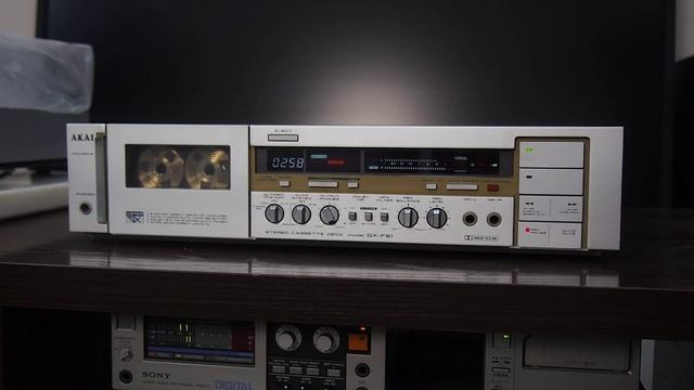 AKAI GX-F51 ¥69,800(1982年頃) Очень красивый аппарат. Высочайшее качество звучания. Дека с хранения, хранилась в упаковке долгое время, поэтому так хорошо выглядит.На видео проверка деки: калибровка ленты, запись, воспроизведение. ツインフィールド・スーパーGXヘッドなどのアカイ独自の技術を投入したステレオカセットデッキ。 ヘッドには、一つのヘッドハウジングに録音専用ギャップ(4μ)と再生専用ギャップ(1μ)をいもつアカイ独自のツインフィールド・スーパーGXヘッドを採用しています。 コアにはHigh Bs、High μを誇るクリスタルフェライトを用い、メタルテープへの対応も実現しています。 キャプスタン駆動用には、高い回転精度、低ワウ・フラッター、ハイトルクのFGサーボDDモーターを使用しており、ダイレクトドライブの安定性をFGサーボによる制御で確実なものとしています。 さらに、リール駆動用モーターにはハイトルクDCモーターを採用しており、伝達効率の高いシンプルなリールドライブ機構と相まって、駆動系のクオリティをより充実させています。 メカニズムには、新機構のメカニズムであるクイック&クワイエットメカニズムを搭載しています。 各モードの設定を、マイコン制御の専用モーターが行うコンパクトなシステムコントロールメカニズムで、これによってメカノイズを低減しています。さらに、ストップ状態でもヘッドブロックは従来のポーズ位置までリフトアップされているため、プレイ動作の立ち上がりも速く、耐久性にも優れています。 録再アンプおよびマイクアンプを、+−2電源方式によるDCアンプ構成としており、厳選されたデバイスを用いることで諸特性を改善しています。 ダイレクトリードインシステムを搭載しており、イジェクトされた状態でカセットハーフをセットすれば、希望のオペレーションボタンを押すだけで、自動的にローディングし、テープのたるみを除去して指示された動作に入ります。 また、イジェクト機構もマイコン制御のパワードライブ方式で、プレイ中でもイジェクトボタンを押せば自動的にイジェクトします。 カセットハーフをローディングするだけで、テープポジションを自動的に検出するオートテープセレクター気候を搭載しています。 検出と同時にバイアスとイコライザーがアカイのリファレンス値に設定され、録音ミスを防ぎます。 メーターには2色12セグメントのFLバーメーターを搭載しています。 テープポジション表示をメーター上にも設けており、テープポジションに応じて最大録音入力レベルのワーニングゾーンを示すなど、レベル設定を容易にしています。 レック・キャンセル機構を搭載しており、CMを録音したり録音タイミングを誤った時に、ワンタッチで録音を中止し、曲間まで巻戻し、4秒間の無音録音をしたのち録音スタンバイにすることが可能です。 また、次の曲から曲の頭を10秒ずつスキップ再生して聴きたい曲が探せるイントロスキャンや、ワンタッチで自動的に前後の曲の頭を呼び出すIPLS(自動頭出し)機構、カウンター0000位置まで巻戻し自動的にプレイを始めるメモリーオートプレイ機構を搭載しています。 ノイズリダクションシステムとして、従来のドルビーBタイプに加えCタイプを搭載しています。 オートコンピューターチューニングシステムを搭載しています。 使用するテープに最適のチューニングを自動的に行い、テープ特性を引き出しており、バイアス設定はRchでレベル検出を行い、1ステップ2.5%ずつ8つのステップで順次バイアスを変化させ、1kHz・10kHzを1組にして同レベルの録音を行い、1kHzと10kHzのレベルが一致したところを最適バイアス値としています。 また、録音感度レベルの設定も1kHz信号を1dBステップで8ステップに分けて録音し、1kHzの基準レベルと一致するレベルに設定します。 チューニング時間は約25秒で、終了と同時に巻戻し、録音スタンバイとなり、どのテープに対してもフラットな周波数特性で録音が可能となります。また、チューニング動作はチューニング専用のマイコンがコントロールし、一度チューニングしたデータは、テープポジションごと1つずつメモリー可能で、次に同じブランドの同種のテープを使用するときにチューニングしなおす手間が省けます。 また、チューニングレックポジションを装置しており、タイマー録音時もオートテープチューニングをしてから録音に入るため、クオリティの高い留守録が行えます。 オートフェーダーを搭載しており、録音モード時にワンタッチでフェードイン・フェードアウトが可能です。 録音スタンバイ状態でこのボタンを押せば、設定した録音レベルまで自動的にフェードインし、録音を開始します。また、逆に録音中に押せば、自動的にフェードアウトし、無音録音部分をつくり、録音スタンバイとなります。 タイマースタート機構を搭載しており、別売りのタイ