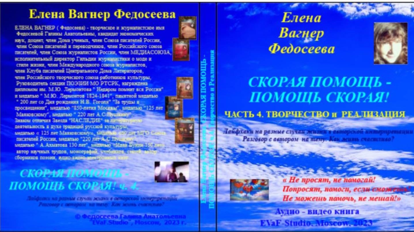Helena Vagner Fedoseeva Анонсирую выход в свет моей новой аудио-видео-книги. 2023. год. Анонсы в видео-вариантах на ютуб, рутуб, ВК, Дзен! Книгу можно приобрести в личное пользование. Елена Вагнер Федосеева СКОРАЯ ПОМОЩЬ -ПОМОЩЬ СКОРАЯ! Часть 4. Творчество и реализация Лайфхаки на разные случаи жизни в авторской интерпретации Разговор с автором на тему: Как жить счастливо? « Не просят, не помогай! Попросят, помоги, если сможешь! Не можешь помочь, не мешай!» Аудио& видео книга. EVaF-Studio, Moscow, 2023. От автора: Доброго времени суток, дорогие единомышленники! Представляю Вам свою новую аудио-видео книгу «СКОРАЯ ПОМОЩЬ - ПОМОЩЬ СКОРАЯ!» В книге содержатся актуальные для каждого из нас советы, методики, способы, медитации и технологии, которые позволят нам справиться с различными жизненными ситуациями, которые вызывают у нас беспокойство и неудовлетворенность жизнью. Они позволят нам жить более яркой, насыщенной и счастливой жизнью! 4-я часть называется " Творчество и Реализация". Она посвящена различным аспектам развития в себе творческой личности и корректировке индивидуального, в т.ч. и духовного развития. Цель - стать более счастливым и успешным человеком. Конечно, для того, чтобы все эти прогнозы воплотились в жизнь, необходимо изменить свой менталитет, используя предлагаемые лайфхаки, жить более осознанно, не на «автомате». Я просто делюсь опытом жизни и учусь вместе с Вами жить более счастливо и полноценно! Предлагаю совершенствоваться вместе! Мир меняется на наших глазах самым кардинальным образом, происходит явное сближение и взаимопроникновение земного, плотного мира с мирами тонкими. Явления, порой не объяснимые с научной точки зрения, становятся нашей реальностью. Необходимо подготовить свое сознание к новому мировосприятию и жизни в новых изменившихся условиях. Буквально на наших глазах происходит крах старого мира и возникновение нового, с новыми законами взаимодействия между людьми и природой. В подарок вам - комплексные медитации для формирования нового, многомерного сознания человека Новой Эпохи Водолея. Сочетание научных и эзотерических знаний и информации дают синергетический эффект продвижения на Пути эволюции. Не для этого ли мы все здесь сейчас собрались? Как подготовить свое сознание к жизни в Новом мире? Как помочь своему организму настроиться на более высокие вибрации? Об этом и многом другом данная аудио-видео-книга, которая, кстати, существует только в аудио-видео-вариантах. Ситуационные медитации Вам в подарок! Книгу можно приобрести в личное пользование и находиться в процессе трансформации и преображения сознания круглосуточно вне зависимости от наличия доступа к Интернету! С Любовью, ЕВФ. Содержание Часть 4. Творчество и Развитие. 60. Магический портал «Врата льва» +медитация. 61. Чужая агрессия. 62. Как противостоять чужой агрессии? 63. Мастерство завершения конфликта с агрессором. 64. Тайны человеческой психики. 65. 7 ступеней зашлакованности организма. 66. Избавляемся от шлаков и токсинов в домашних условиях. 67. Как подсознание притягивает желаемое? 68. Любая встреча – кармическая. 69. Неприятные ощущения правильного пути. 70. Целительная медитация по мотивам Луизы Хэй. 71. Ангельская медитация. 72. Как избежать залипания? 73. Когда интерес мужчины к женщине пропадает? 74. Женщина-магнит. 75. Тайны, которые мужчины и женщины должны зна