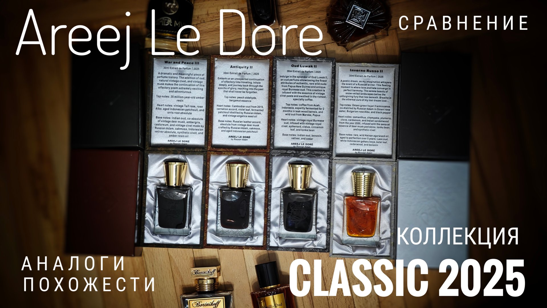 0:00 О этой коллекции 1:40 Inverno Russo II vs Majmua. Плюсы 30мл. О коробках 9:21 Oud Luwak II vs Azman Majnoon 16:18 War and Peace III vs Cupid MVI. Ломросовщина 22:38 Antiquity II - Суперноско. Sayat Nova и Vanilla Oud Заказывать новые парфюмы в моем магазине тут: https://www.avito.ru/moskva/krasota_i_zdorove/originalnyy_novyy_parfyum_duhi_na_podarok_3645091051 Или тут: МаркинПарфюм.РФ Теперь в ВКонтакте есть группа ЭлектроПарфюмер, где так же выкладываются видео. https://vk.com/markinparf Моя цифровая визитка, в которой вы сразу увидите ссылки на все мои профили-магазин-странички-чаты и прочее: https://электропарфюмер.рф/ Телеграм-чат с барахолкой и флудилкой: https://t.me/+xgqFHAKeqnYyN2Vi Начал заниматься подбором и продажей оригинальных ароматов. Я - Михаил Маркин,и я коллекционирую интересные ароматы с 2013 года , а так же собрал себе дальнобойный электромопед, на котором весело катаюсь по Подмосковью с гамаком. Мой телеграм: @markin_trace #электропарфюмер #маркинпарфюм #михаилмаркинпарфюм #парфюммихаил #маркинэлектропарфюмер Резервная ссылка на мой магазин оригинальной парфюмерии Авито : https://www.avito.ru/moskva/krasota_i_zdorove/originalnyy_podlinnyy_parfyum_i_duhi_ot_markina_3100917882 #маркинпарфюмрф