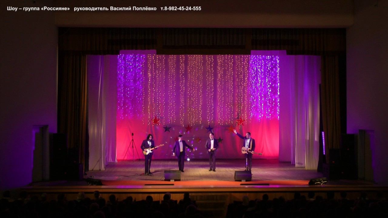 Вокально-инструментальный коллектив шоу-группа «Россияне», Василий Поплёвко - руководитель. т. 8-982-45-24-555, E - mail: rossiane-prazdnik@mail.ru сайт: www.rossiane-show-group.ru Государственные и профессиональные праздники, корпоративы, юбилеи, свадебные торжества! Авторские и эстрадные хиты российских авторов 80 - 90-2000-х, зарубежных авторов - репертуар Абба, Бони эм, Модерн-токинг, Смоуки, Доктор Албан, Битлз, Оттован и др. - интерактив со зрителями, танцевальная программа.