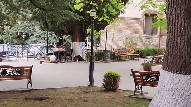 Уличный музыкант играет в парке грузинского города Сигнахи.