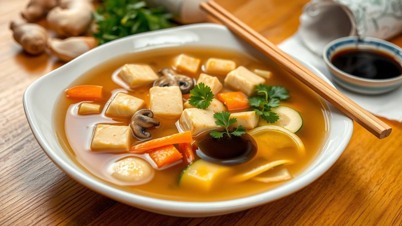 Освежающий Суп мечты: Тофу и хрустящие Овощи в ароматном Имбирном бульоне