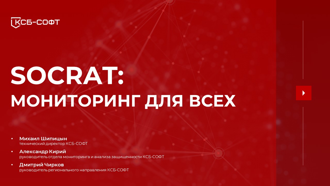 На протяжении уже 4х лет центр мониторинга SOCRAT выявляет нежелательные события ИБ, а также предотвращает кибератаки на раннем этапе. • Какие принципы и подходы используют SOC-аналитики SOCRAT? • Почему сегодня без организации мониторинга и реагирования на инциденты безопасности сложно обнаружить начало целенаправленных кибератак? • Как непрерывное выявление нежелательных событий поможет предотвратить остановку производства и финансовые потери организацией? Эти и другие вопросы в прямом эфире 8 ноября в 10:00 разобрали технический директор КСБ-СОФТ Михаил Шипицын и руководитель отдела мониторинга и анализа защищенности Александр Кирий.