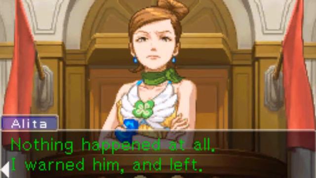 A video walkthrough for Apollo Justice: Ace Attorney for the Nintendo DS. Episode 2: Turnabout Corner. Part 17 of 20. In this part, Alita Tiala testifies about her recent trip to the victim's clinic, in order to warn him about the murder plot against him. Clearly, the warning didn't work, and just as clearly, this story is a lie. After all, she knew about Wocky's botched operation, and she was keeping this a secret from him. Using his powers of perception, Apollo is able to figure out that the information about Wocky's botched operation became a threat to the witness recently. Why? Because of Wocky's recent medical check-up. Alita admits that Wocky's medical chart was troublesome to her, but she claims nothing happened when she asked for it. Apollo then pulls out the bullet that was found inside the safe with the medical records. It seems that someone fired a pistol when the safe was opened. Police analysis says that the bullet came from the murder weapon. She must have stolen the gun from Wocky, but of course, she claims that is not the case.