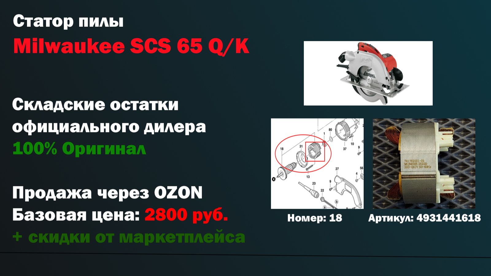 Оригинальный статор для ремонта дисковой пилы Milwaukee, совместим с моделями: Milwaukee SCS 65 Q (SCS65Q / SCS65 Q / SCS 65Q) Milwaukee SCS 65 K (SCS65K / SCS65 K / SCS 65K) Комплект: корпус редуктора в сборе Номер на взрыв-схеме 18: - 18 Только статор 4931441618 Данный статор является оригинальным, новым и прошел: - Визуальную проверку на наличие повреждений; - Проверка сопротивления - Проверка индукции Купить через авито за 2800 руб. https://2uu.ru/4931441618-milwaukee-scs-65-q-k-stator/ Артикул для поиска: 2uumilk4931441618stator Артикул склада: 2-2-1 Milwaukee милка милуоки милвауки ударная дрель оригинал мотор ротор статор якорь ремонт часть запчасть восстановление новый орига мотор двигатель движок движек пилка пила дисковая отрезная обезьянка мощная SCS 65 Q SCS65 Q SCS 65Q SCS 65 K SCS65 K SCS 65K SC 65K