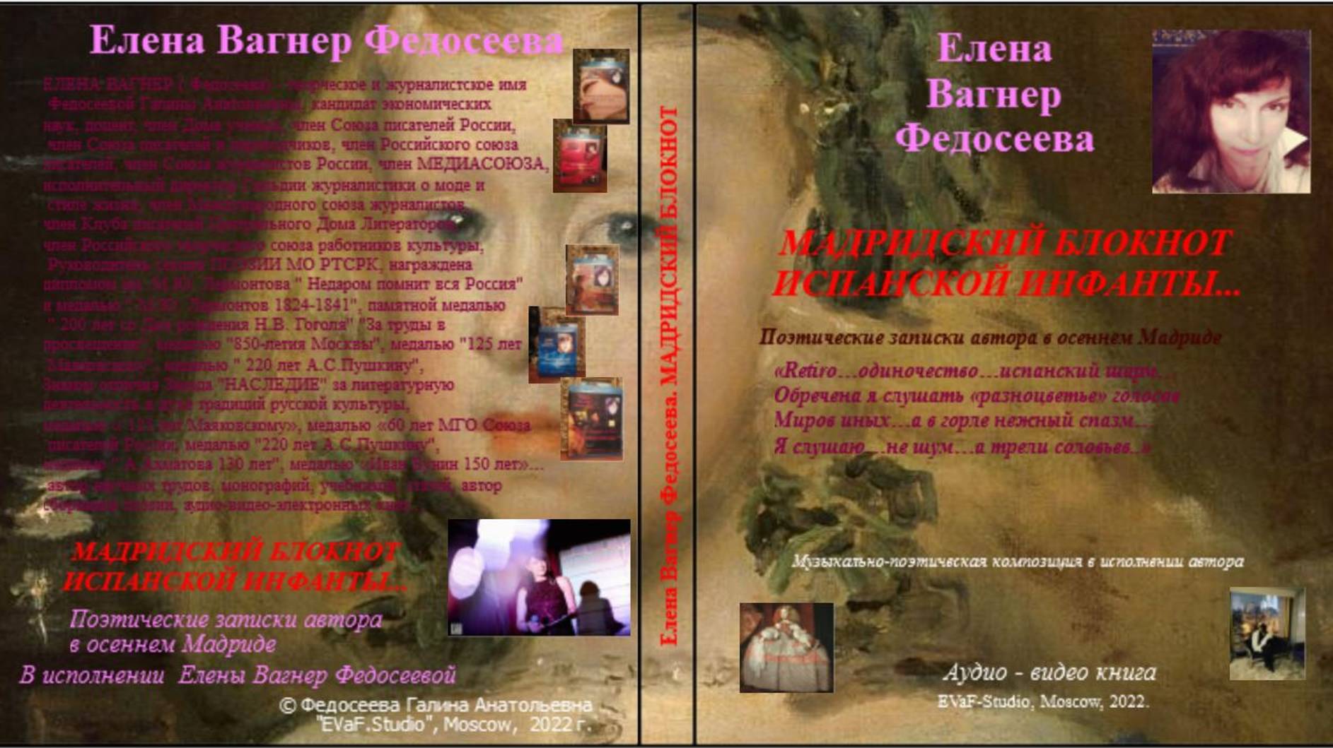 Helena Vagner Fedoseeva Вышла еще одна моя новая аудио-видео книга, апрель 2022. АУДИОКНИГУ МОЖНО ПРИОБРЕСТИ В ЛИЧНОЕ ПОЛЬЗОВАНИЕ! ПИШИТЕ! ЕЛЕНА ВАГНЕР ФЕДОСЕЕВА МАДРИДСКИЙ БЛОКНОТ ИСПАНСКОЙ ИНФАНТЫ. Поэтические записки автора в осеннем Мадриде «Retiro…одиночество…испанский шарм… Обречена я слушать «разноцветье» голосов Миров иных…а в горле нежный спазм… Я слушаю…не шум…а трели соловьев..» Музыкально-поэтическая композиция в исполнении автора. Аудио& видео книга. EVaF-Studio, Moscow, 2022. Дорогие друзья! Приглашаю на поэтическую прогулку по осеннему Мадриду. Стихи написаны в сентябре 2011 года. Цель моей поездки в Испанию была – участие в Неделе Высокой моды Сибелес в Мадриде не только в качестве модели и манекенщицы, но и поэтессы. Планировалось моё поэтическое выступление в Русском центре науки и культуры. По ряду причин оно не состоялось. В качестве своеобразного протеста я отказалась выходить на подиум. Исключение я сделала только для моей подруги Ирины Б. Что оставалось делать в солнечном осеннем Мадриде 2011 - года? Конечно, писать стихи. В апреле 2022, почти 10 лет спустя я впервые представляю эти поэтические и мемуарные зарисовки широкой публике как напоминание о мирном времени… Сейчас , весной 2022 европейцы отказываются от своих традиционных ценностей, запрещая всё русское – музыку, картины, искусство… чудовищно, конечно… я не знаю, как к этому относиться… я всегда была уверена, что на почве красоты люди понимают друг друга лучше, чем на экономическом или политическом поприще… время показало, что это не так… во всяком случае для некоторых, чье сердце, вероятно, стало слишком жестким… или всегда было таким… в любом случае, я делюсь мыслями и чувствами, которые отражены в этих поэтических текстах, написанных мною в осеннем Мадриде в сентябре 2011 года. С любовью, автор, ЕВФ. СОДЕРЖАНИЕ 1. Капуччино по-мадридски… 2. Визит почти закончен… 3. Фламенко ритмы огненные жгучая испанка… 4. Ах, как прелестно, чисто любование… 5. О, муза! Вдохновения легчайший шорох 6. Королеве Изабелле II… 7. О, страшный враг земной красы…о, время! 8. Адам и Ева… 9. Маха. to Ф. Гойя… 10. По мотивам картин Босха… 11. Hermafrodito… 12. Разговор с гермафродитом… ( Лувр) 13. Ищу…ищу…исканья, к счастью, не бесплодны… 14. Не заглушает дикий шум цивилизаций… 15. Не слышу…не читаю тайные с небес послания… 16. Я жду…кафе…паэлья…beer and tapes… 17. Коррида… 18. Русские впервые на Сибелес… 19. Шафраны золотые… 20. Retiro…одиночество… 21. Ещё раз о Триптихе Босха... 22. Рай... земля... ад… Триптих Босха… Для сведения: ЕЛЕНА ВАГНЕР ( Федосеева) - творческое и журналистское имя Федосеевой Галины Анатольевны, кандидат экономических наук, доцент, поэт, писатель, художник, независимый журналист, член Дома ученых, член Союза писателей России, член Союза писателей и переводчиков, член Российского союза писателей, член Союза журналистов России, член МЕДИАСОЮЗА, исполнительный директор Гильдии журналистики о моде и стиле жизни, член Международного союза журналистов, член Клуба писателей Центрального Дома Литераторов, член Российского творческого союза работников культуры, Руководитель секции ПОЭЗИИ МО РТСРК, награждена дипломом им. М.Ю. Лермонтова " Недаром помнит вся Россия" и медалью " М.Ю. Лермонтов 1824-1841", , памятной медалью " 200 лет со Дня рождения Н.В. Гоголя" "За труды в просвещении", медалью "850-летия Москвы", медалью "125 лет Мая
