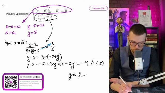 Решите систему уравнений: (х - 6)(у - 5) = 0, (у - 2)/(х+у-8) = 3 - №15728