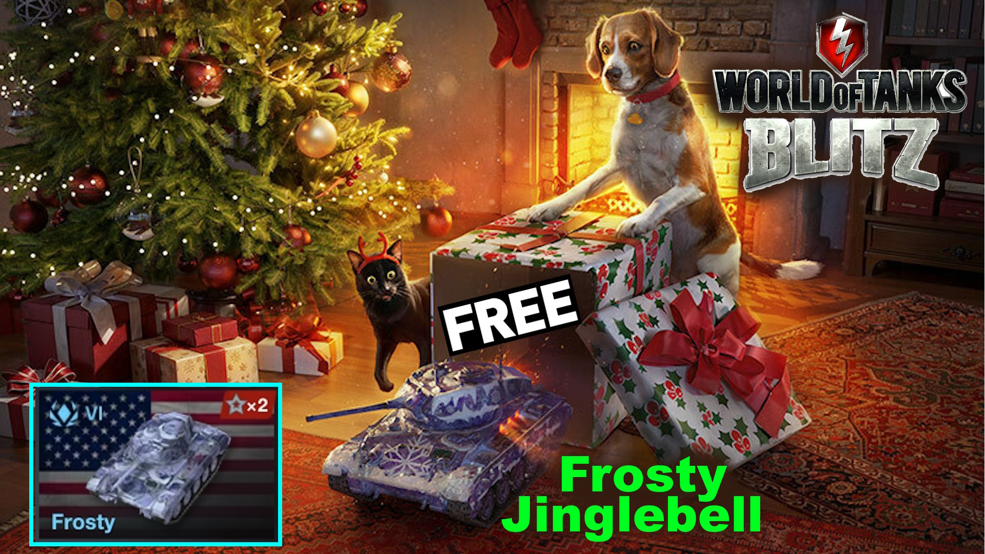Халявный танк за вход в танки блиц.Зайди в игру до 31 декабря и забери Frosty Jinglebell!Если Frosty Jinglebell не появился в Ангаре при входе в игру, скатай бой — и он домчит к тебе